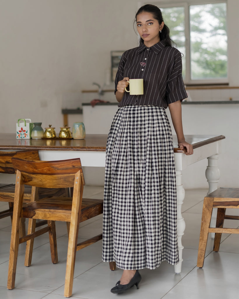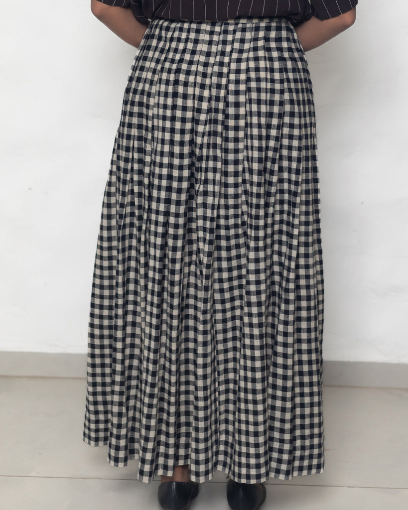 Grace in Monochrome: Woven from organic cotton, this skirt in subtle black and white checks dances with quiet elegance. The pleating at the waist flows like a soft breeze, adding a touch of grace to every step.The side zip and functional pockets make it as practical as it is elegant, allowing it to be styled with anything from a basic tee to a tailored blouse. Whether worn to work, on vacation, or for a casual brunch, this skirt is a versatile piece for all seasons.