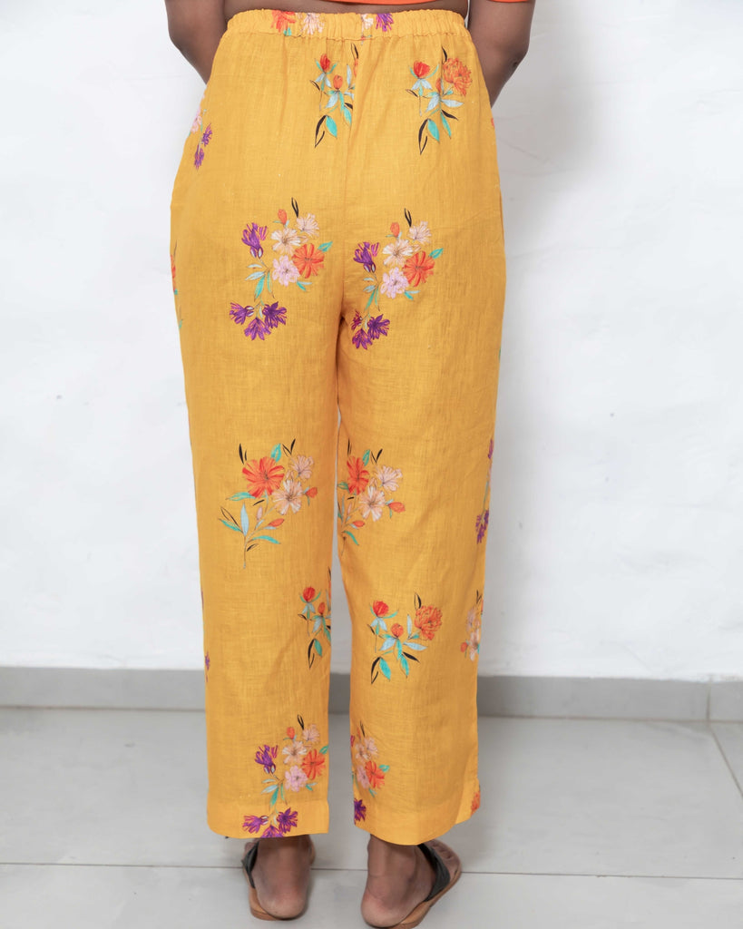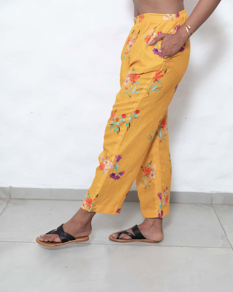 n a burst of sunshine yellow, these high-waisted, pleated linen pants bloom with a bright floral print, a symphony of color and comfort. With functional pockets at the side, they’re the perfect companion for a day that takes you from a morning meeting to a sunset stroll, effortlessly transitioning from casual to classy.