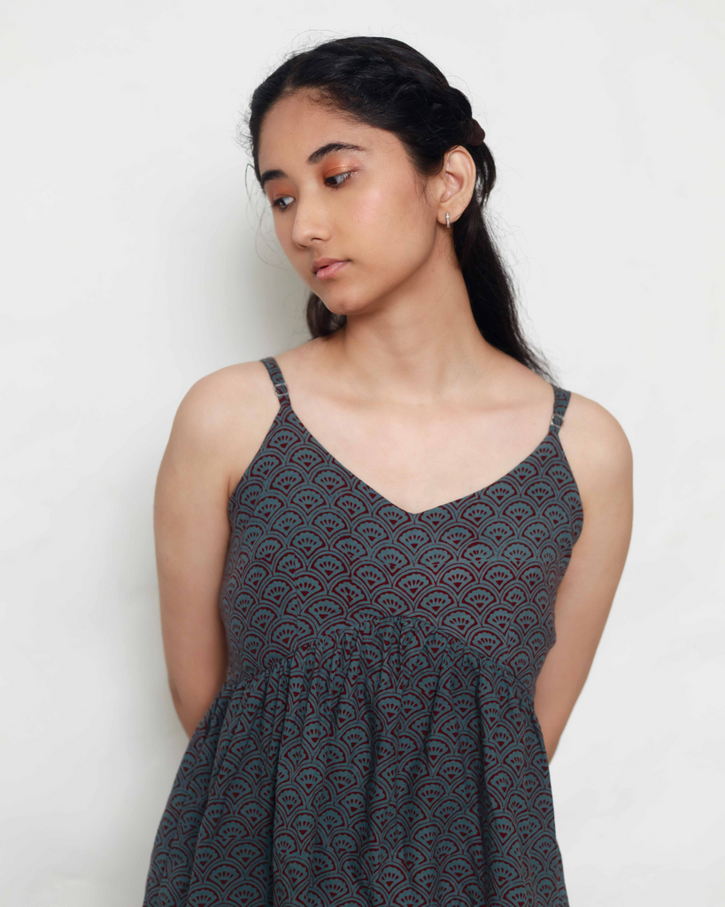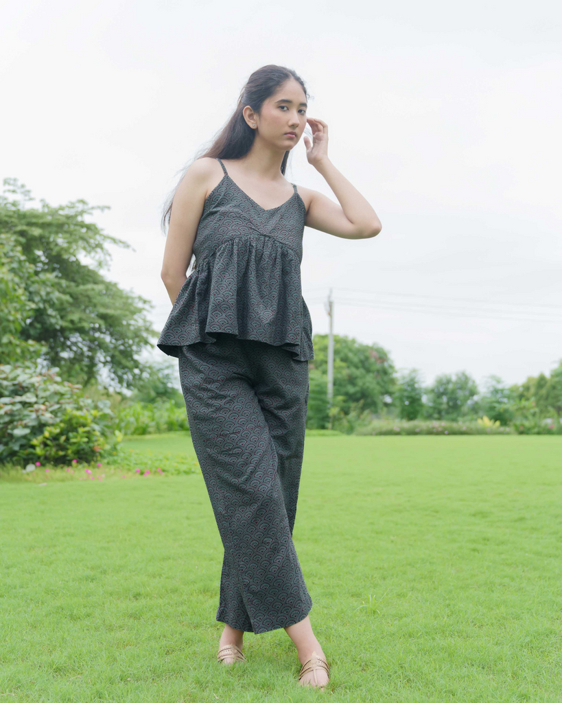 This cotton camisole top is your perfect companion for hot summer days, combining comfort with a fashionable edge. The empire waist seam and fit-and-flare design accentuate your silhouette, while the organic dyes and hand block-printed patterns bring a touch of artisan charm. Complete with matching pleated pants and practical side pockets, this set is ideal for lounging or exploring new destinations.