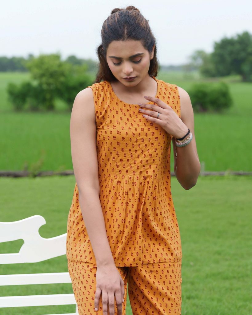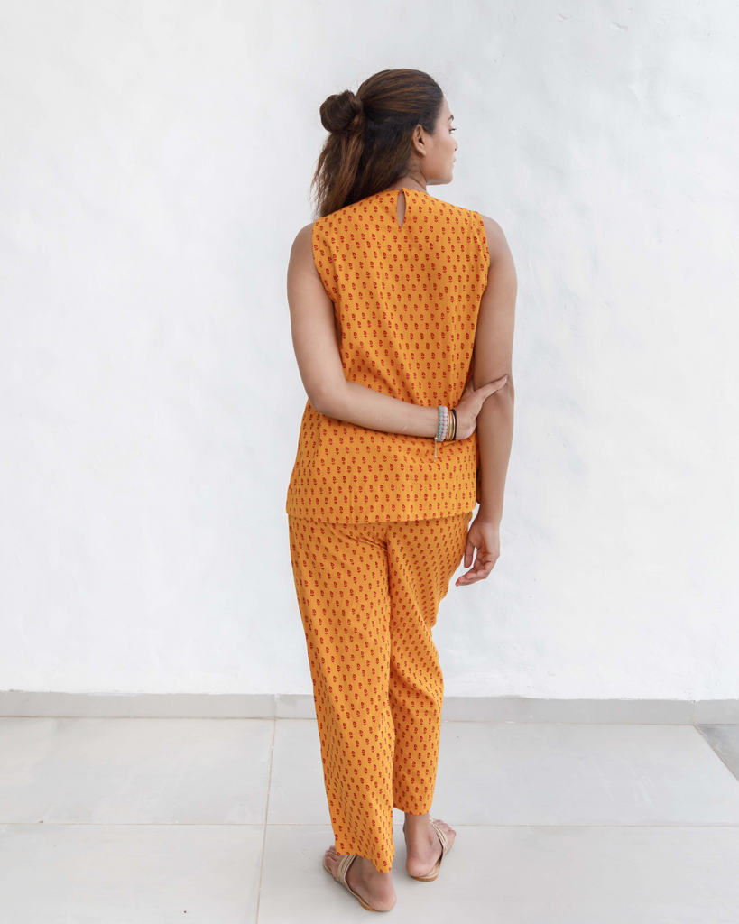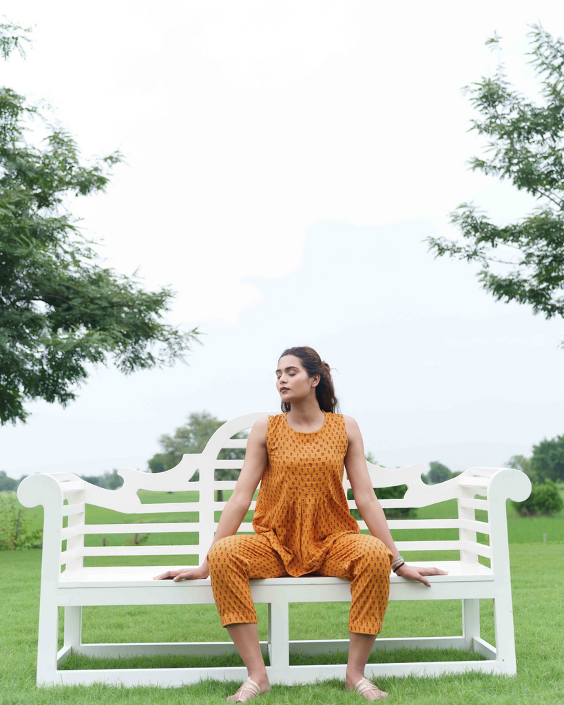 Embrace the essence of slow fashion with our sleeveless top, crafted with natural dyes and block-printed with care. The front pleating details add a touch of sophistication, while the relaxed-fit matching pants provide ultimate comfort for summer travels and leisurely days at home.