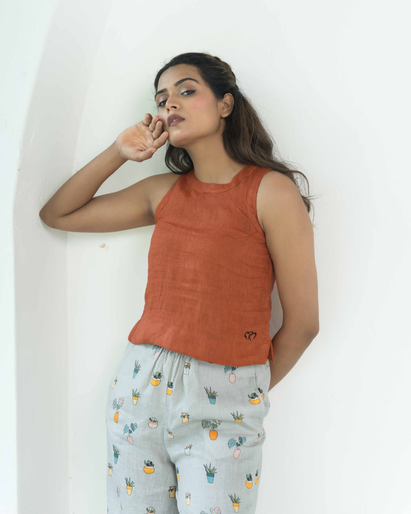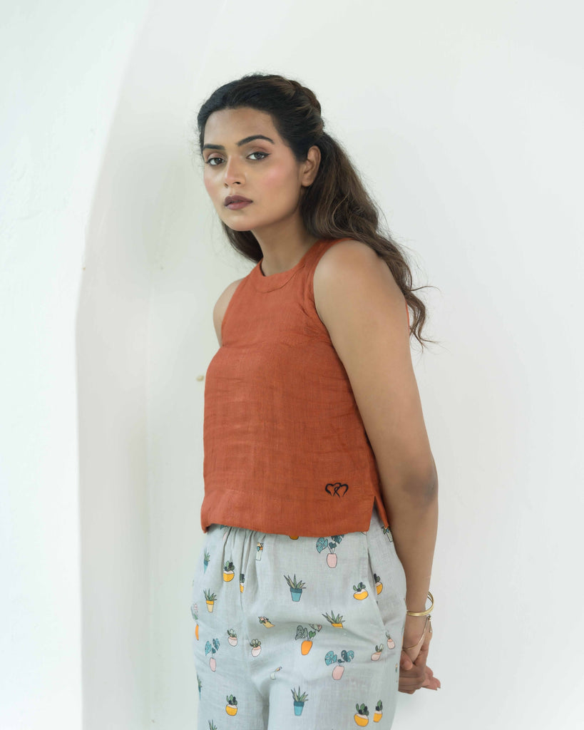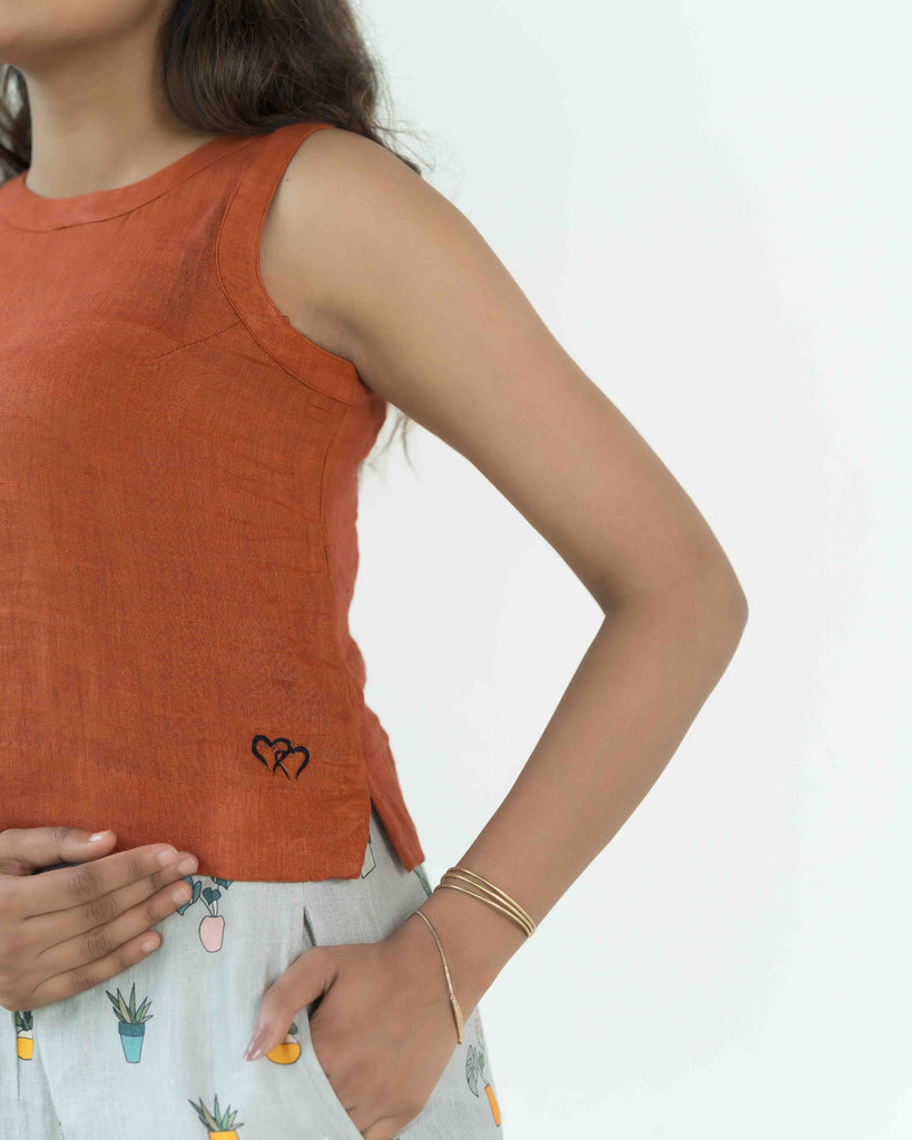 Timeless Linen Love: This sleeveless wonder, made from handloom linen and adorned with delicate heart embroidery, speaks the language of effortless style. Ideal for any season, it pairs beautifully with your go-to pants or jeans, ready to accompany you from desk to dinner with ease.