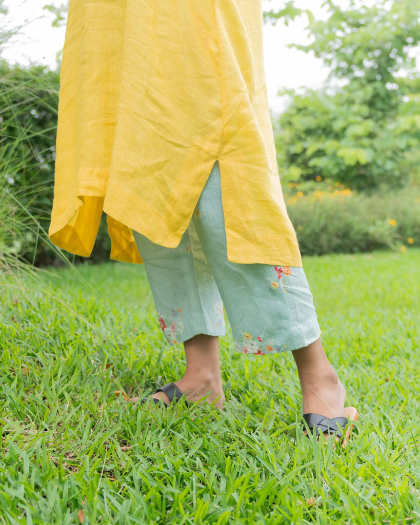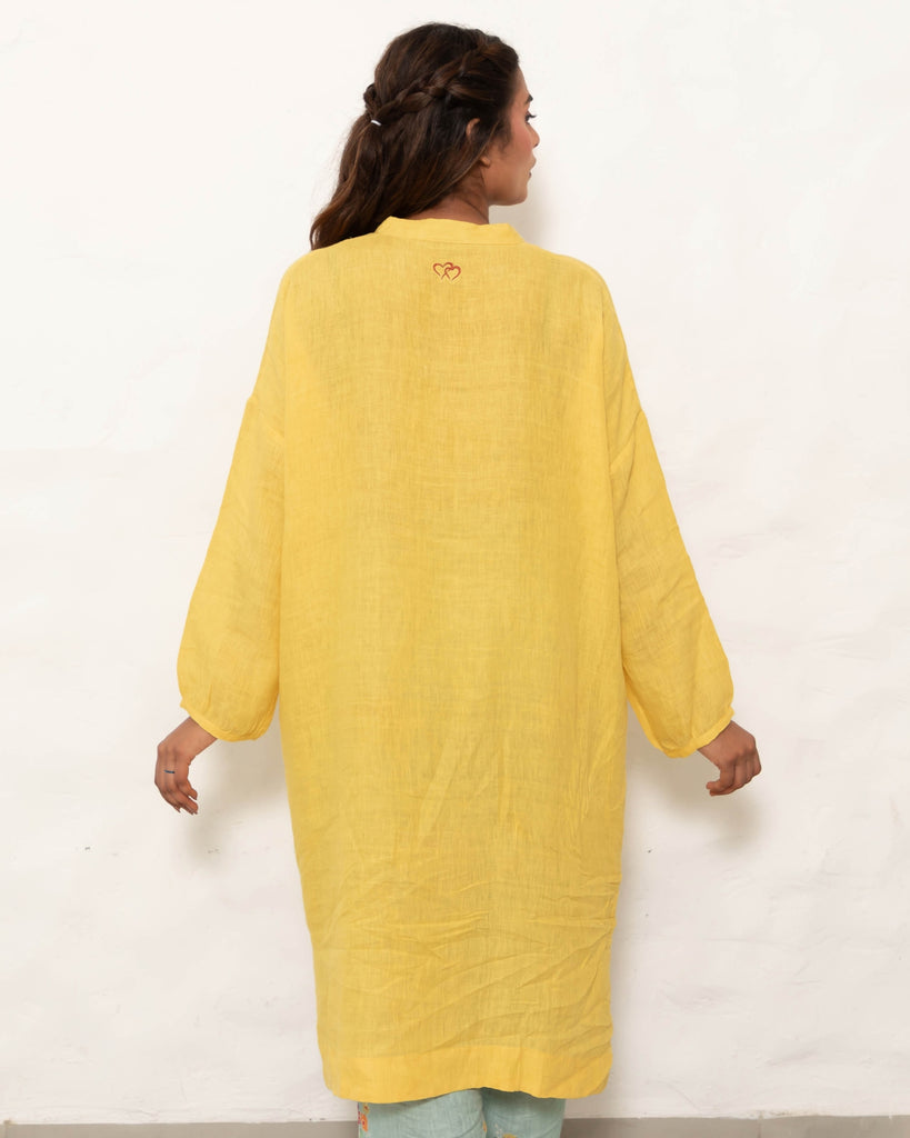 This tunic, as bright as a sunflower under a summer sky, features a modern mandarin collar and an overlapping placket that flows like poetry. Heart motif embroidery graces the back, a delicate reminder of love's gentle presence. Crafted from pure handloom linen, the full sleeves with cuffs and dropped shoulder cut lend an effortless grace, making it perfect for any season, and any adventure—from business to pleasure.