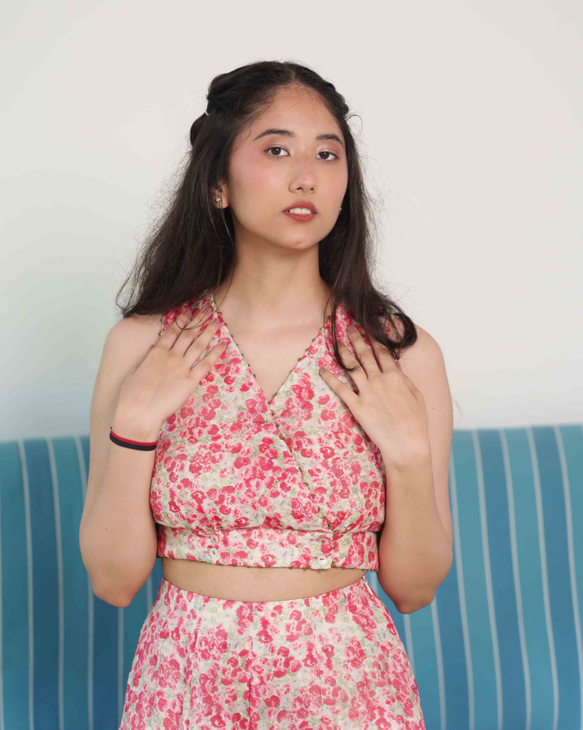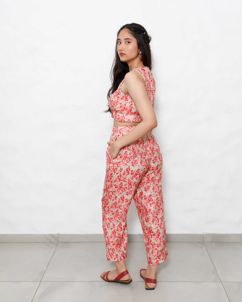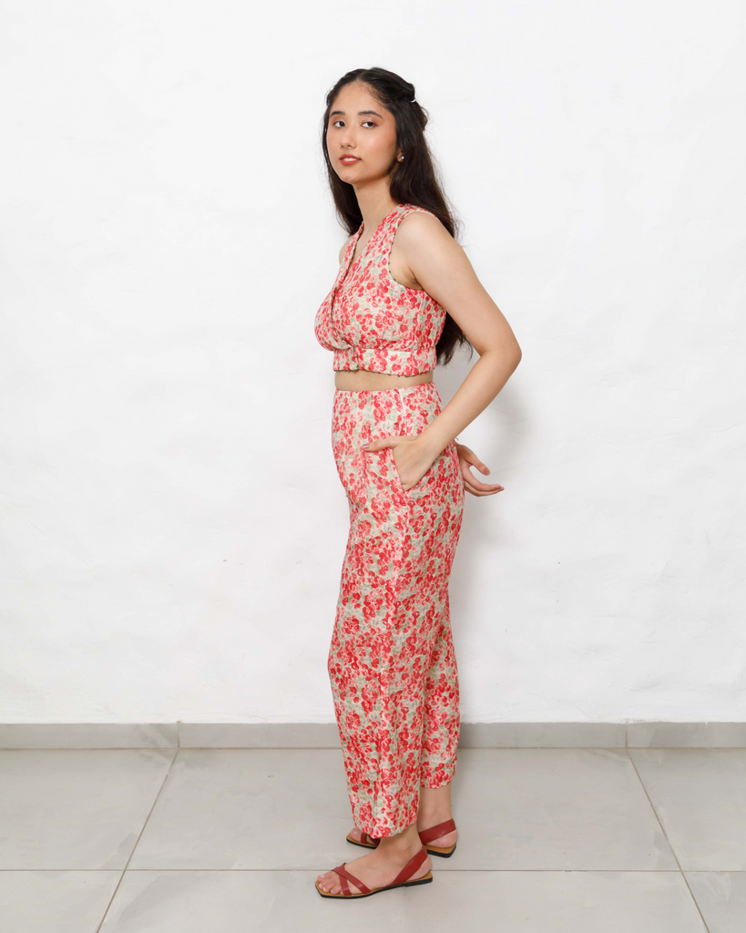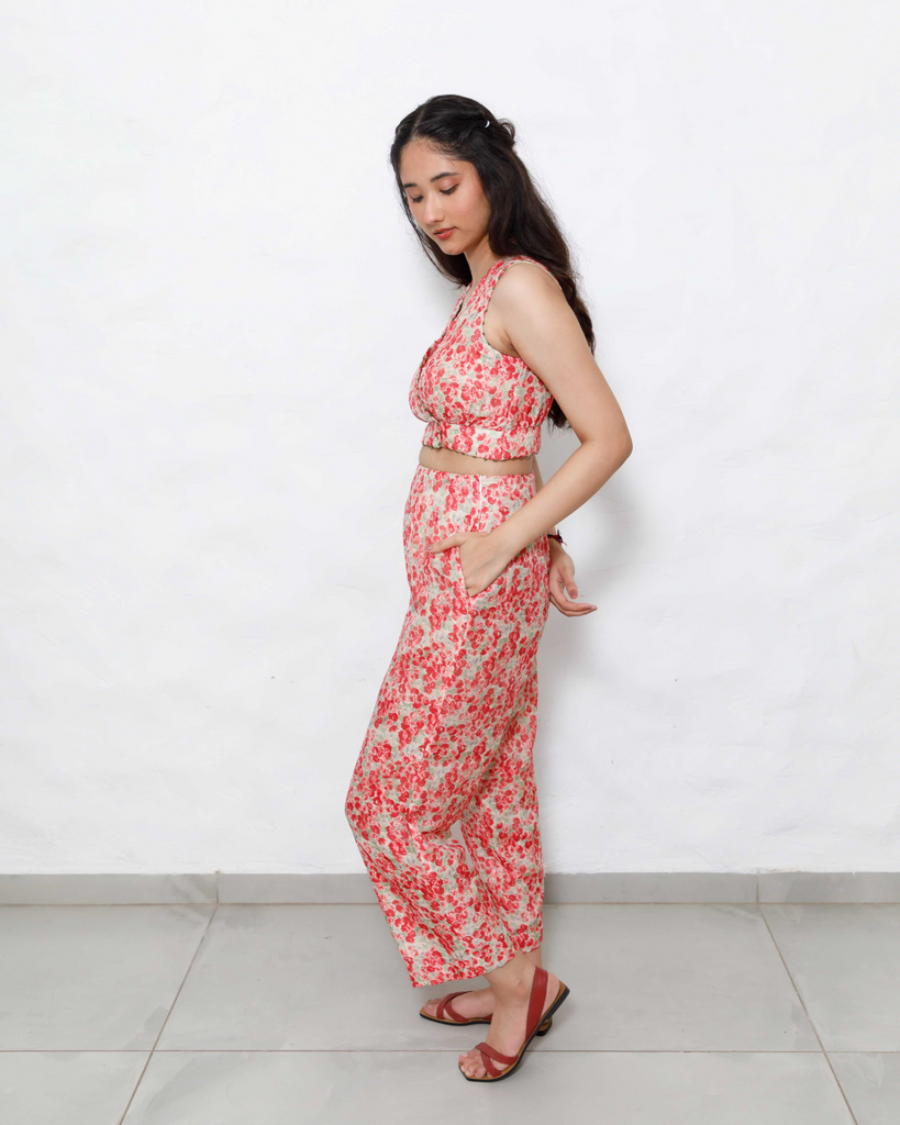 Indulge in the effortless elegance of this handwoven silk and cotton blend co-ord set, featuring a lightweight floral print fabric. The sleeveless crop top with a chic overlapping design and matching relaxed-fit pants make this ensemble perfect for any special occasion, weekend gathering, or romantic dinner date.