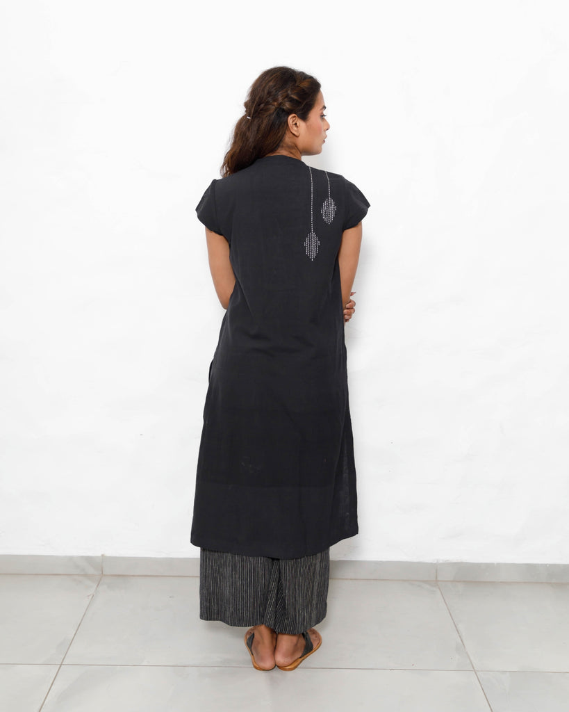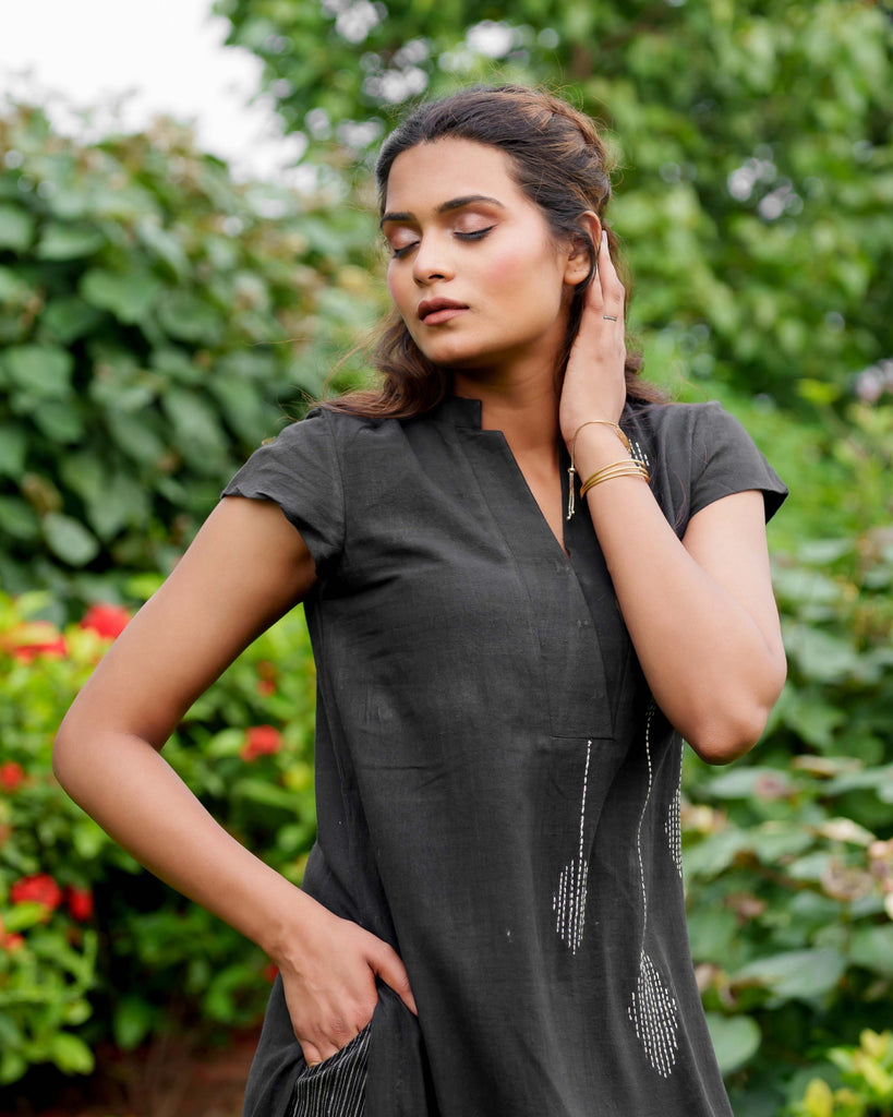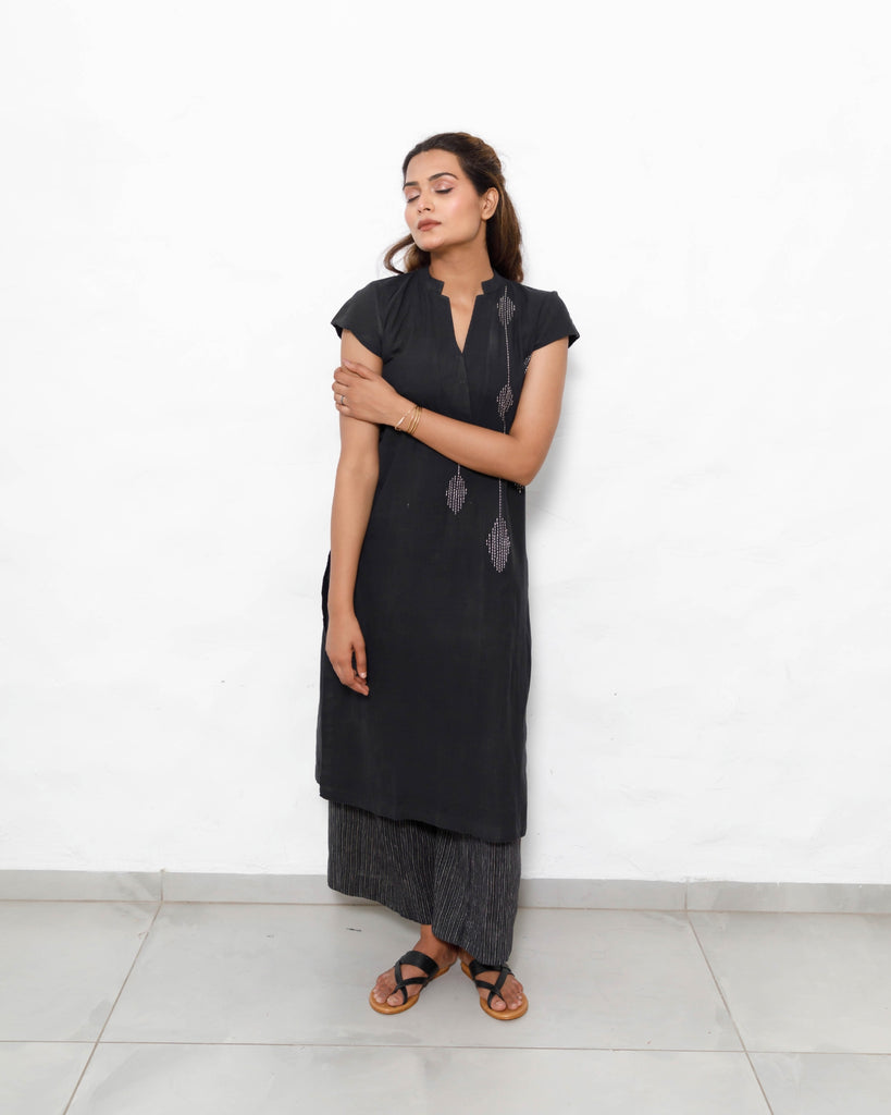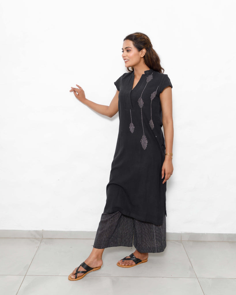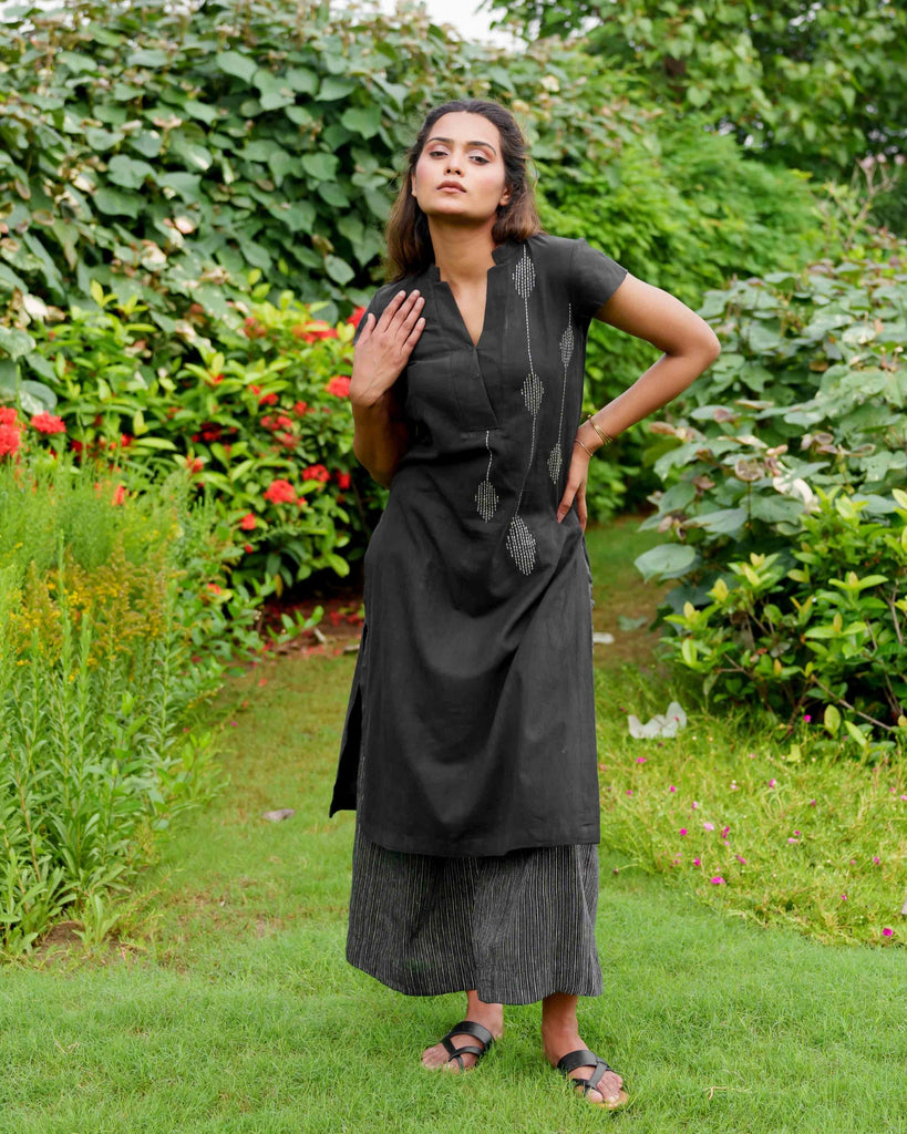 Noir Ensemble: This classic black co-ord set is a dance of textures and details. The handloom cotton top, with its mandarin collar, overlapping placket, and delicate embroidery, meets its match in the wide-leg pants, crafted from organic cotton with a subtle striped pattern. Together, they create a look that is both timeless and versatile, perfect for any occasion, any time of year.