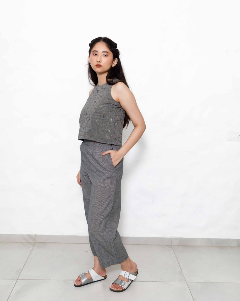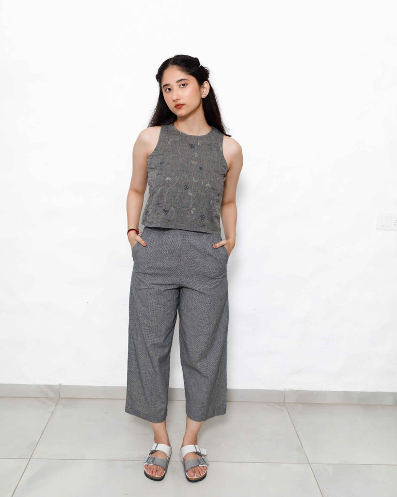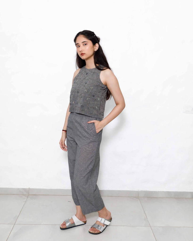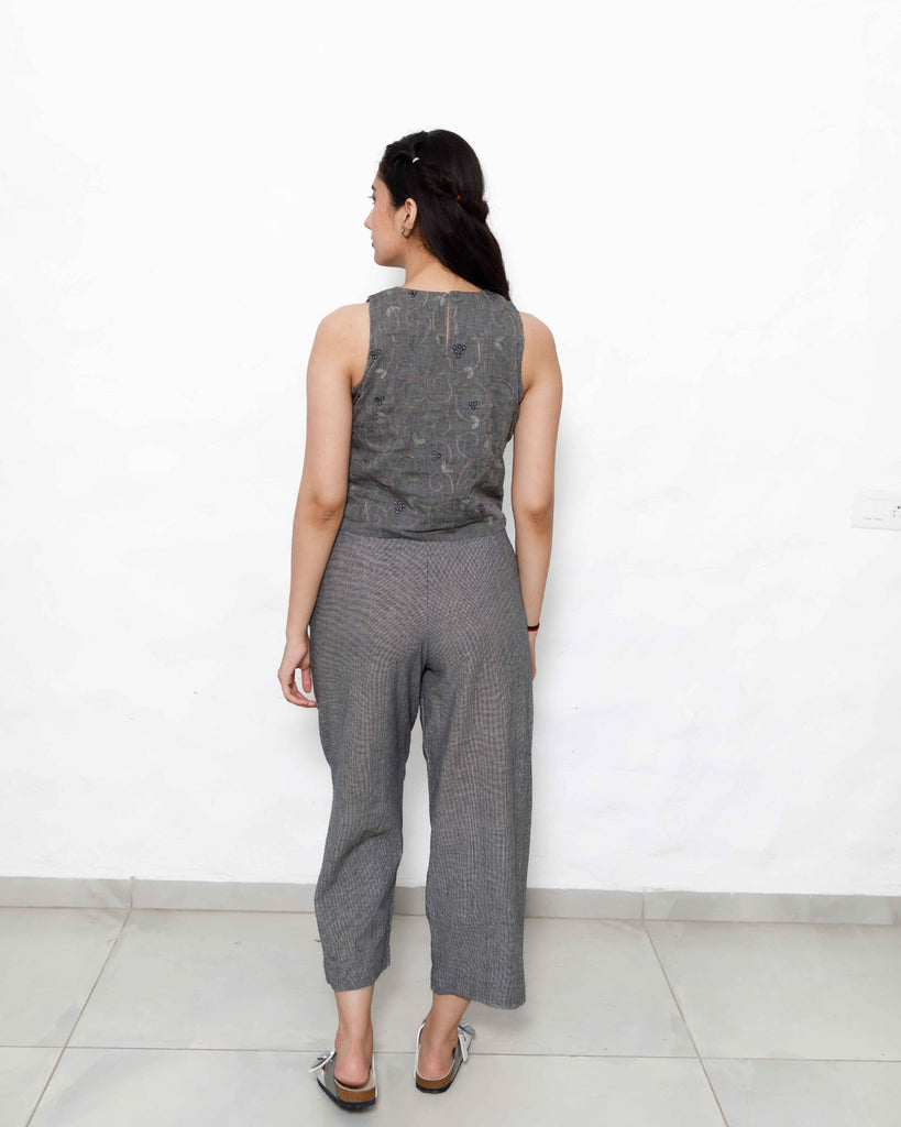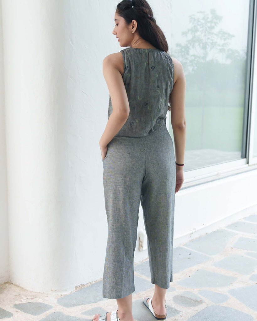 Sophisticated Co-ord Set in Handloom Cotton: This spruce blue co-ord set combines understated elegance with modern functionality. The sleeveless top features subtle embroidery, providing a refined look, while the coordinating pants in tints of blue and black offer a relaxed, high-rise fit. Handwoven from pure cotton, this set embodies sustainable fashion, ideal for workwear, travel, or casual gatherings. With a side zip and functional pockets, it’s designed for both style and practicality.