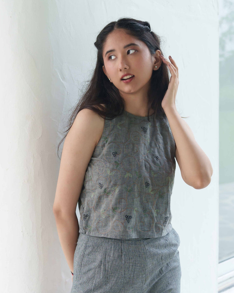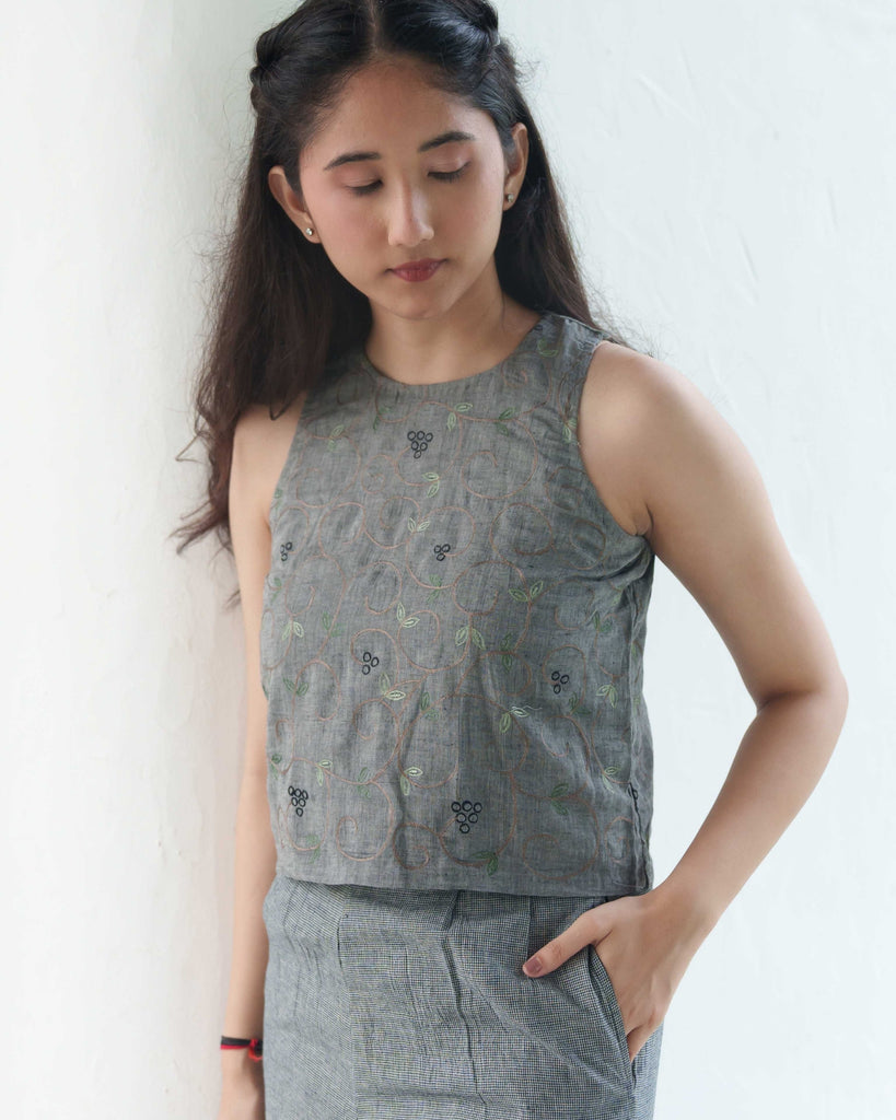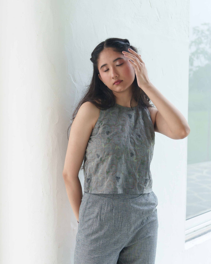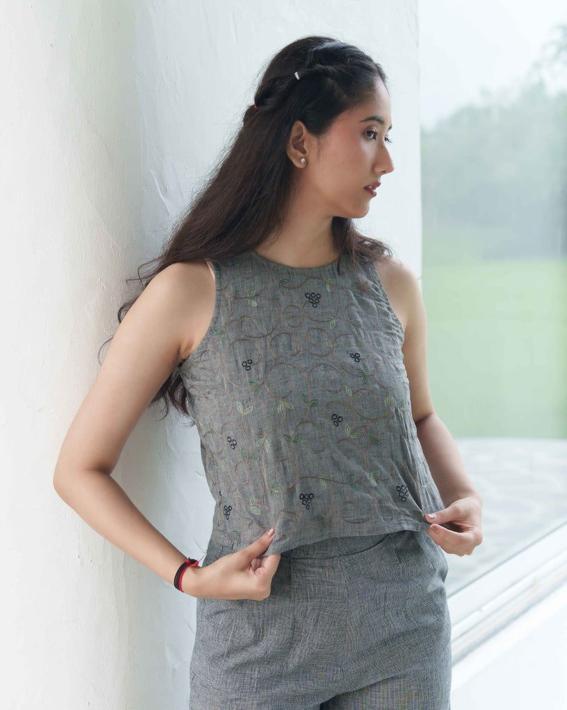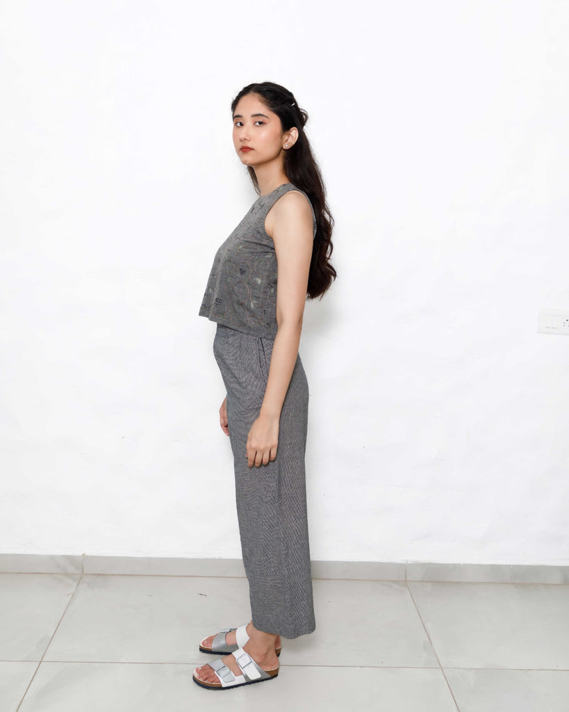 Sophisticated Co-ord Set in Handloom Cotton: This spruce blue co-ord set combines understated elegance with modern functionality. The sleeveless top features subtle embroidery, providing a refined look, while the coordinating pants in tints of blue and black offer a relaxed, high-rise fit. Handwoven from pure cotton, this set embodies sustainable fashion, ideal for workwear, travel, or casual gatherings. With a side zip and functional pockets, it’s designed for both style and practicality.