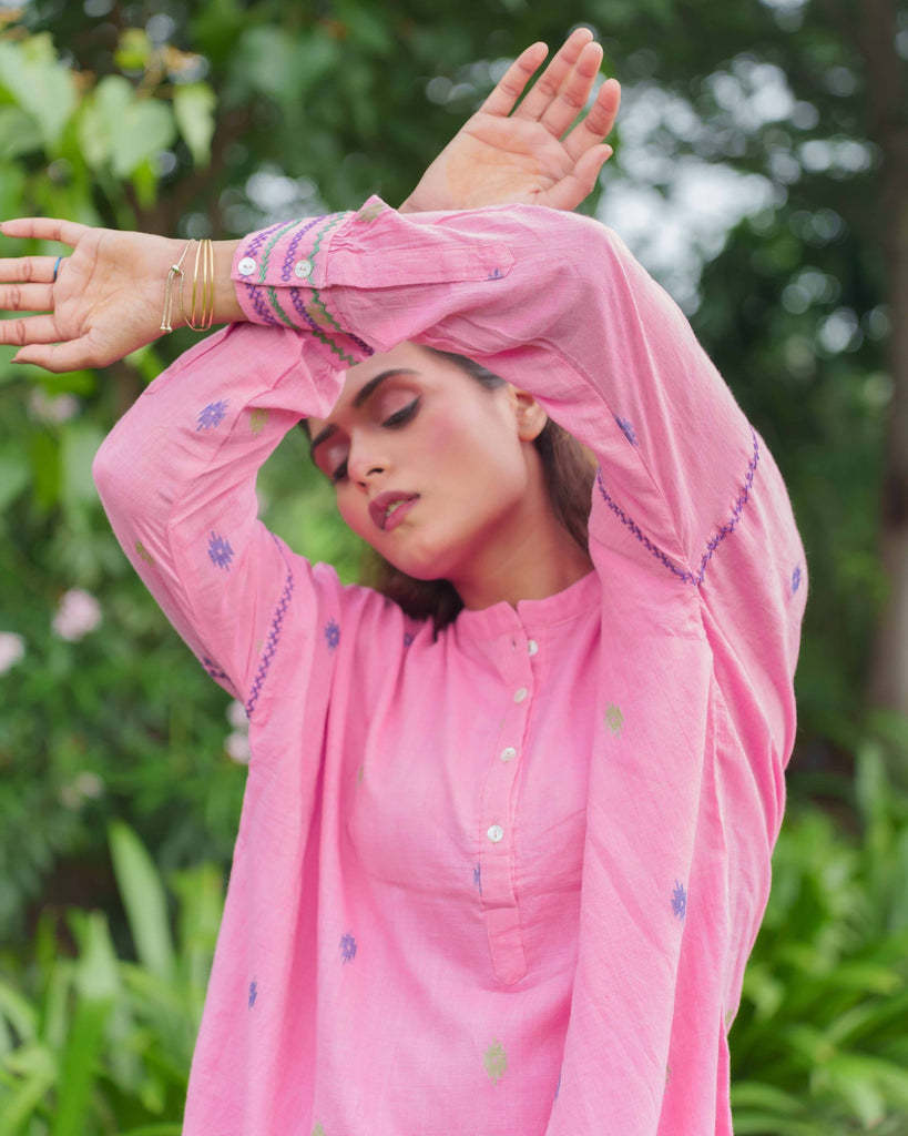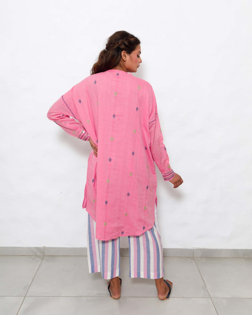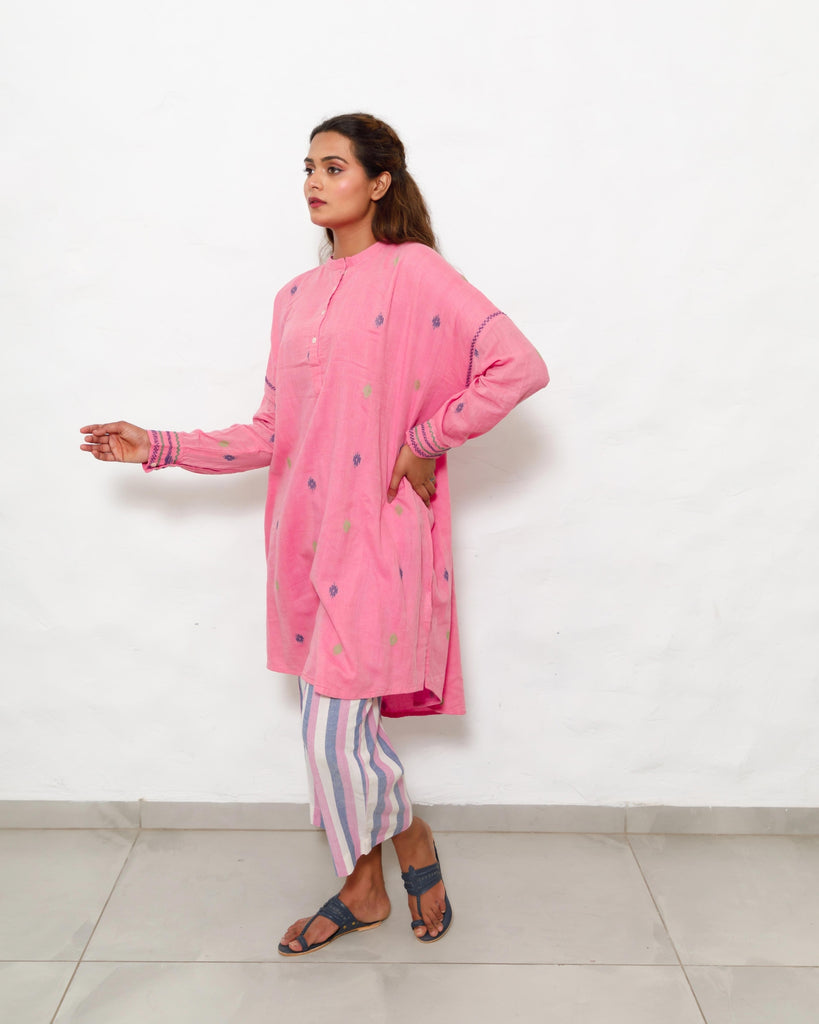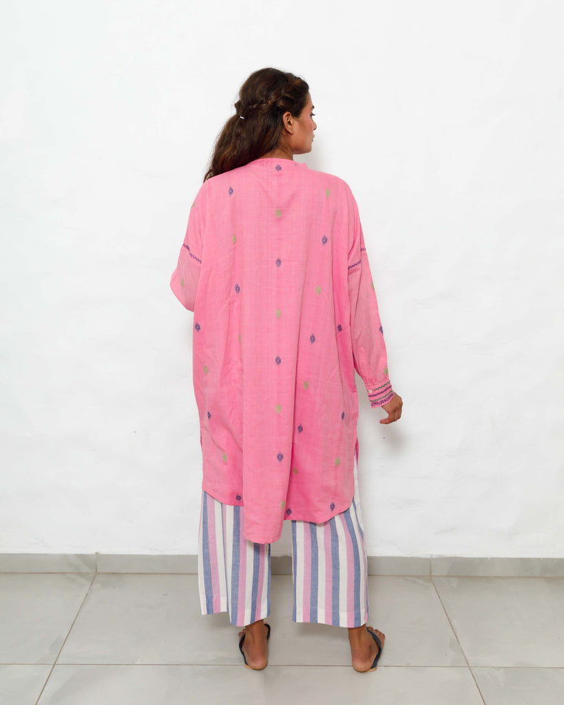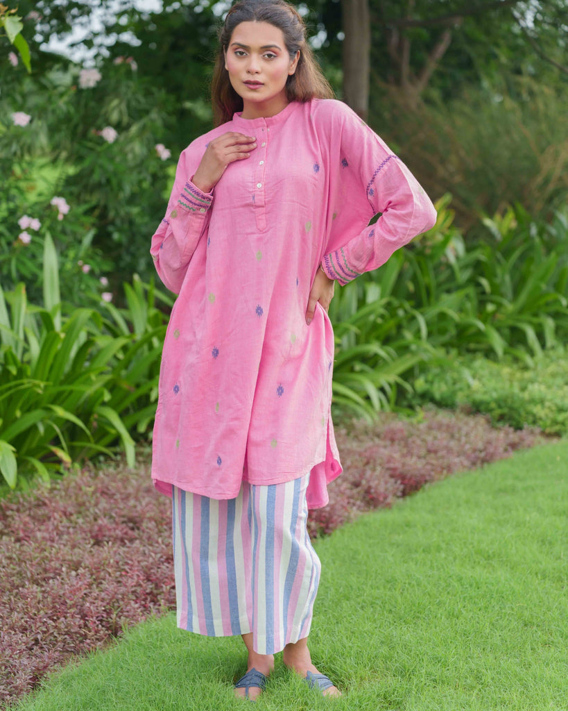 Cotton Bloom: A fresh bloom in cotton, this bright pink tunic with a mandarin collar and high-low hemline embodies the spirit of a carefree day. Hand-embroidered cuffs and armholes add a touch of intricate beauty, while the striped pants offer a subtle contrast in texture. A delightful co-ord set for any occasion, from a busy workday to a relaxed weekend.