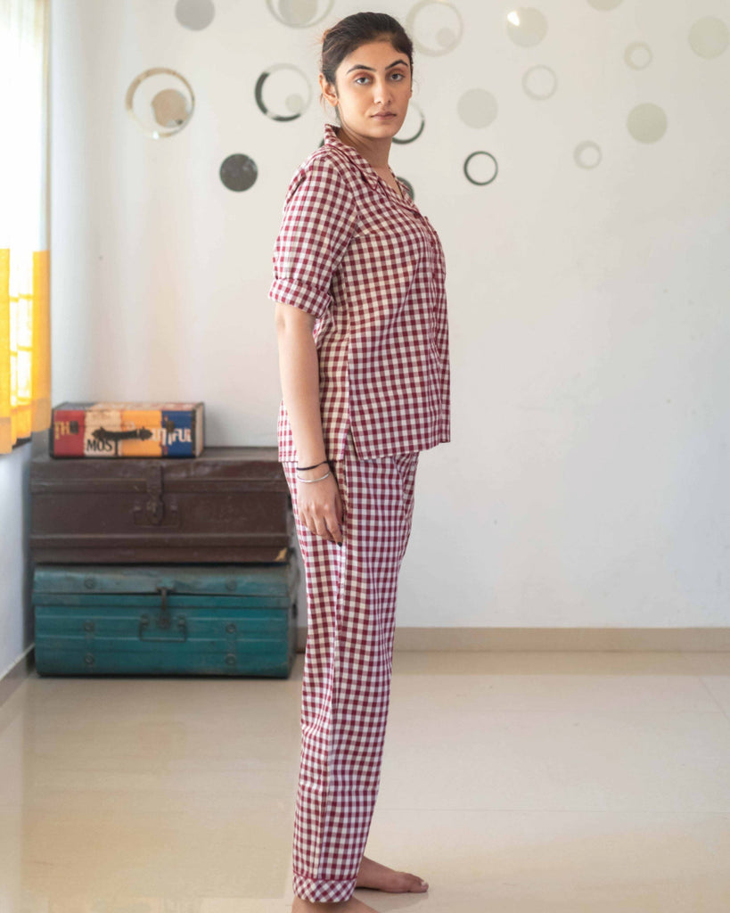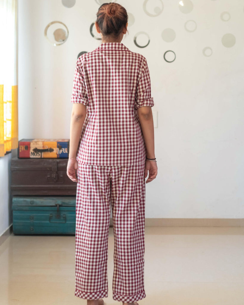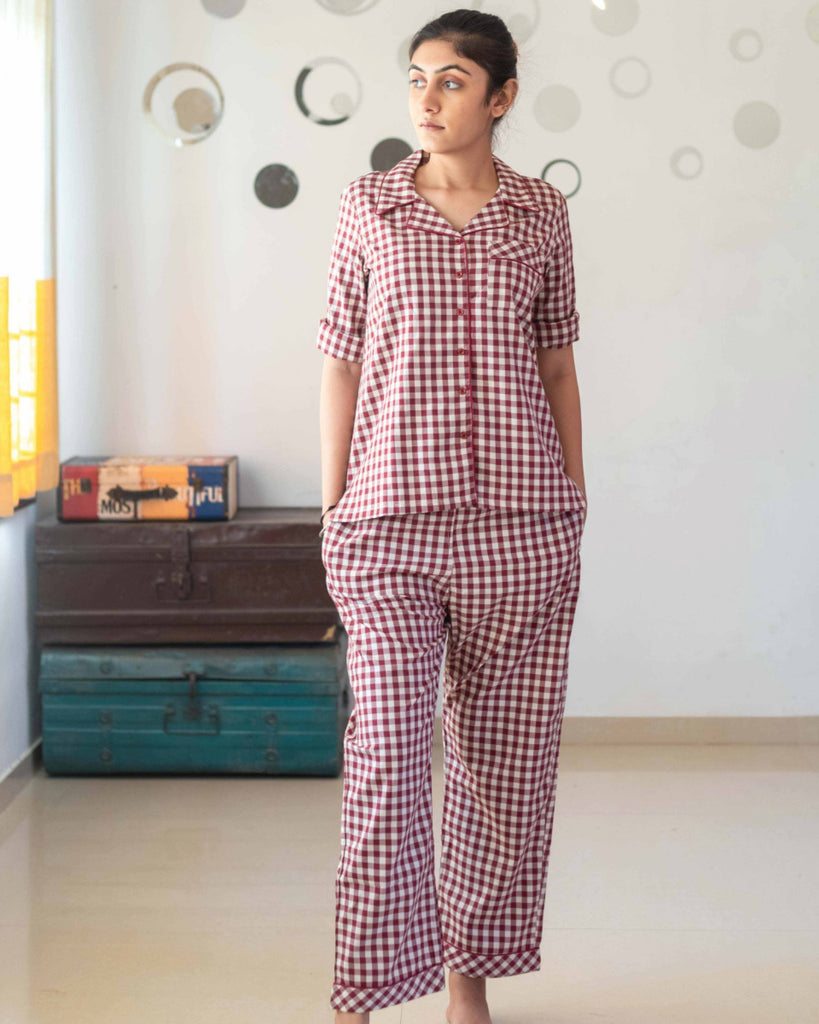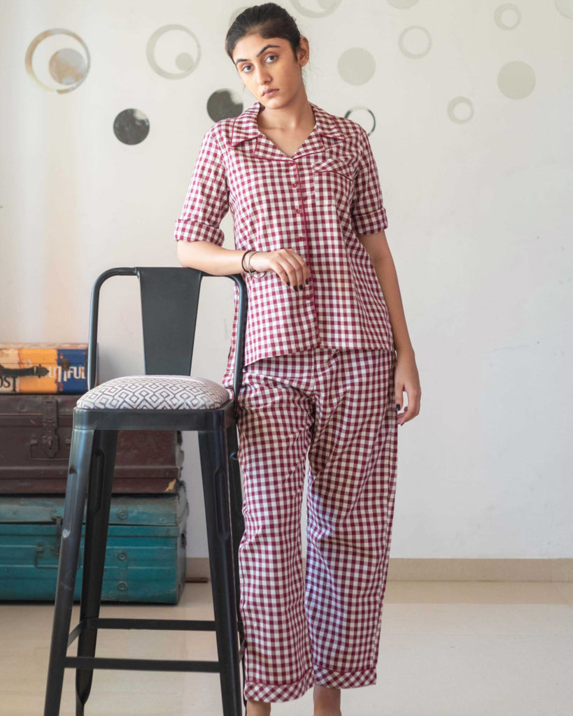 This signature Notched Collar comes as a classic checkered pattern lapel, button down shirt in breathable poplin fabric. In hues of sangria red and chiffon white, our 'butterbeer' notched collar pyjama set comes in a relaxed fit with its two-part coordinated pyjama set and contrasted details. So get ready to throw a slumber party in this classic Pj’s.