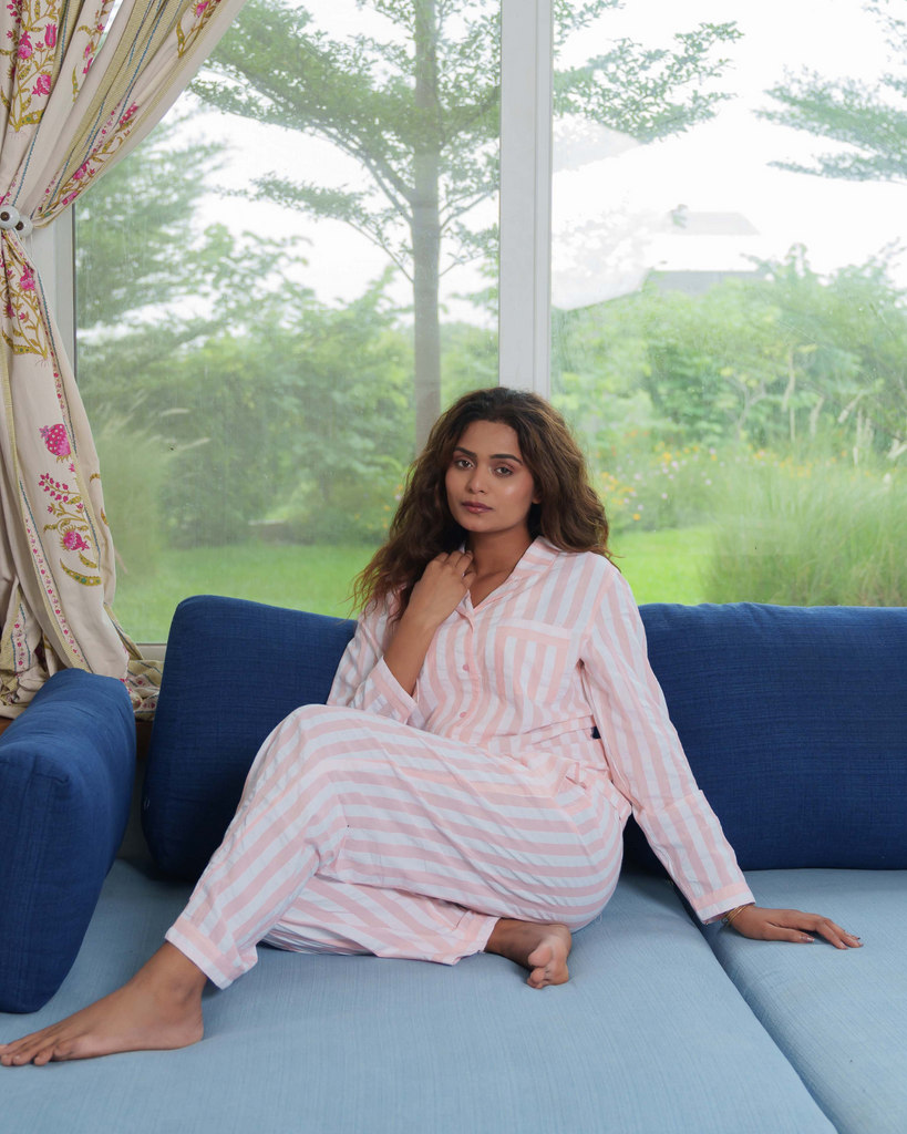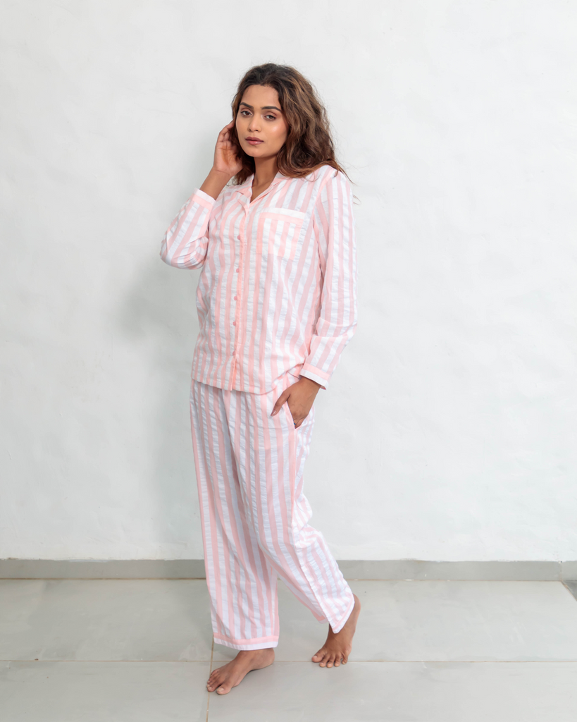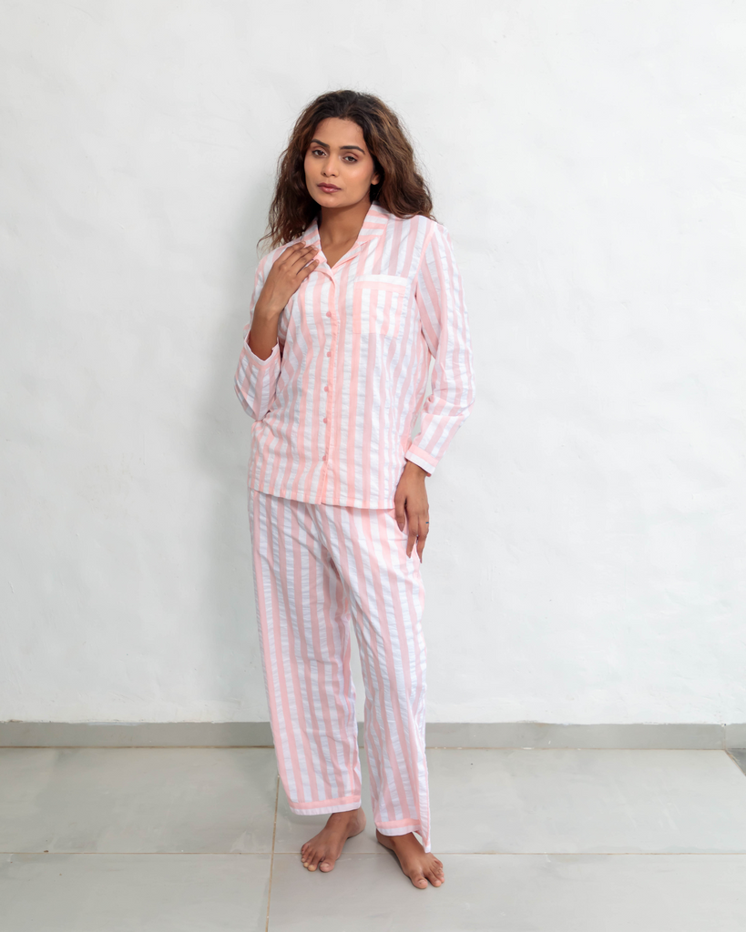 Carrying a fresh essence, our 'holiday punch' pyjama set is definitely a great choice to wear a year long. Notched collar will give you comfort and classic look to dive into a slumber party.