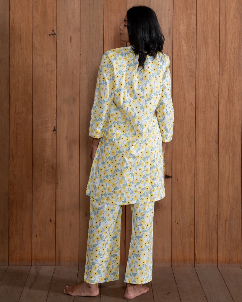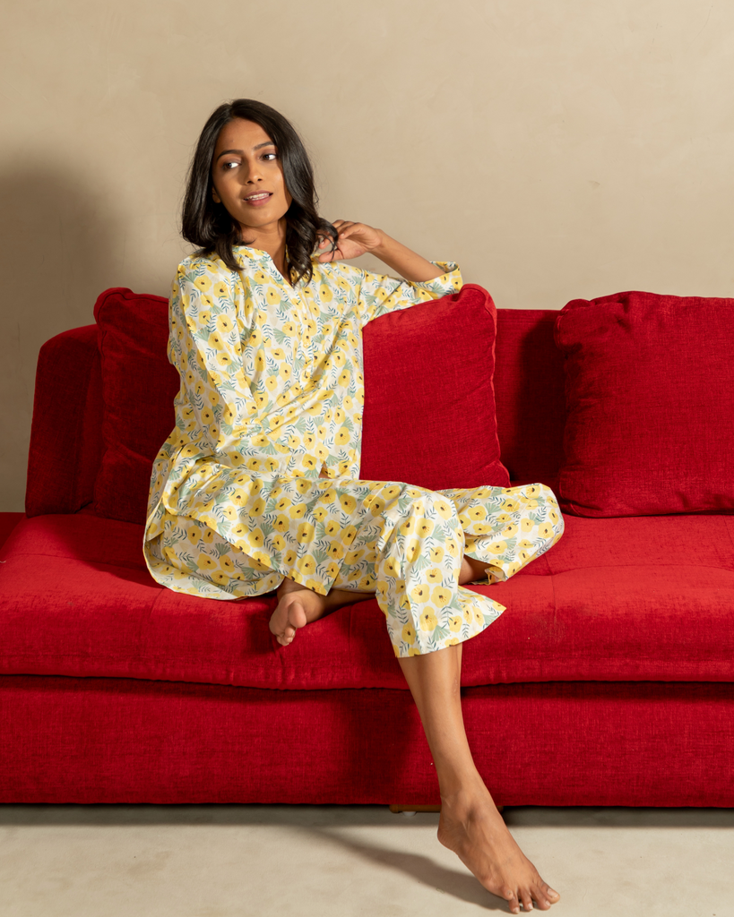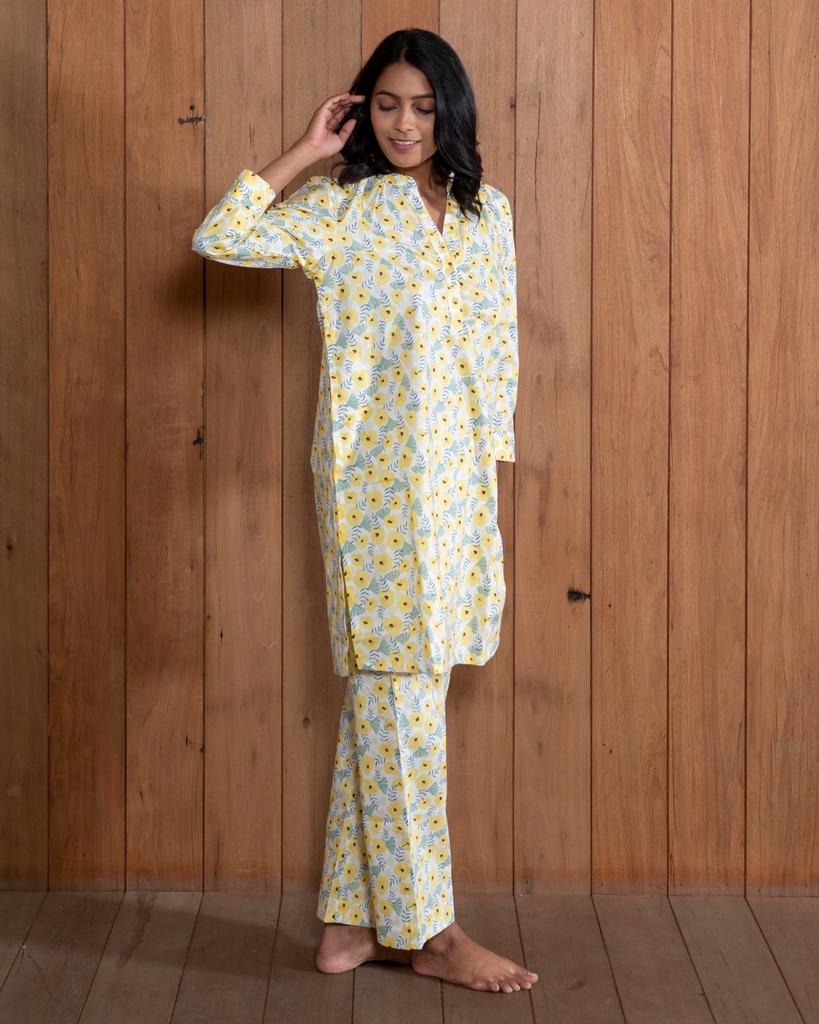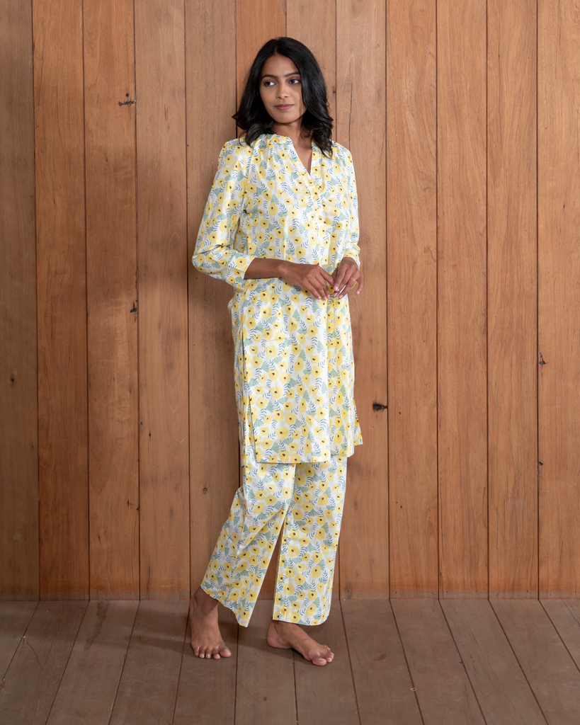 The buttercup kurta set is beautifully crafted piece with mandarin collar and continuous placket details. We enhanced kurta with delicate gatherings details on front neck. This kurta set is designed to lounge indoors for your me time or put it for small family or friends gathering at home.