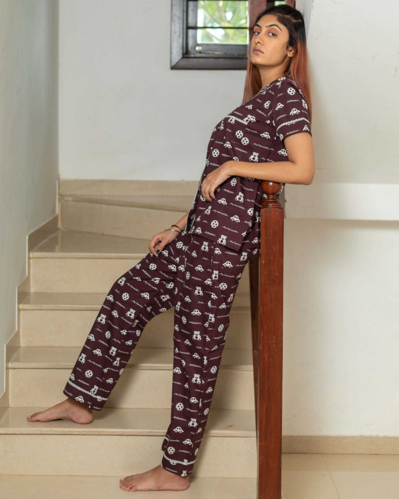 This cozy chocolate-colored pyjama set is the perfect way to relax and unwind after a long day. The charming unique print will take you back to days of childhood and make bedtime a fun time. Crafted with comfort and style in mind, the set is made of 100% cotton and is designed with your relaxation in mind. Snuggle up in the Childhood Memories pyjama set and drift off in no time!