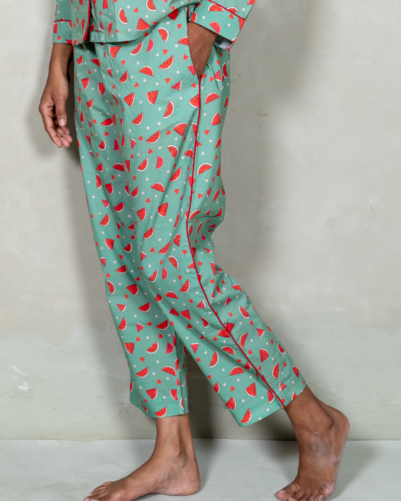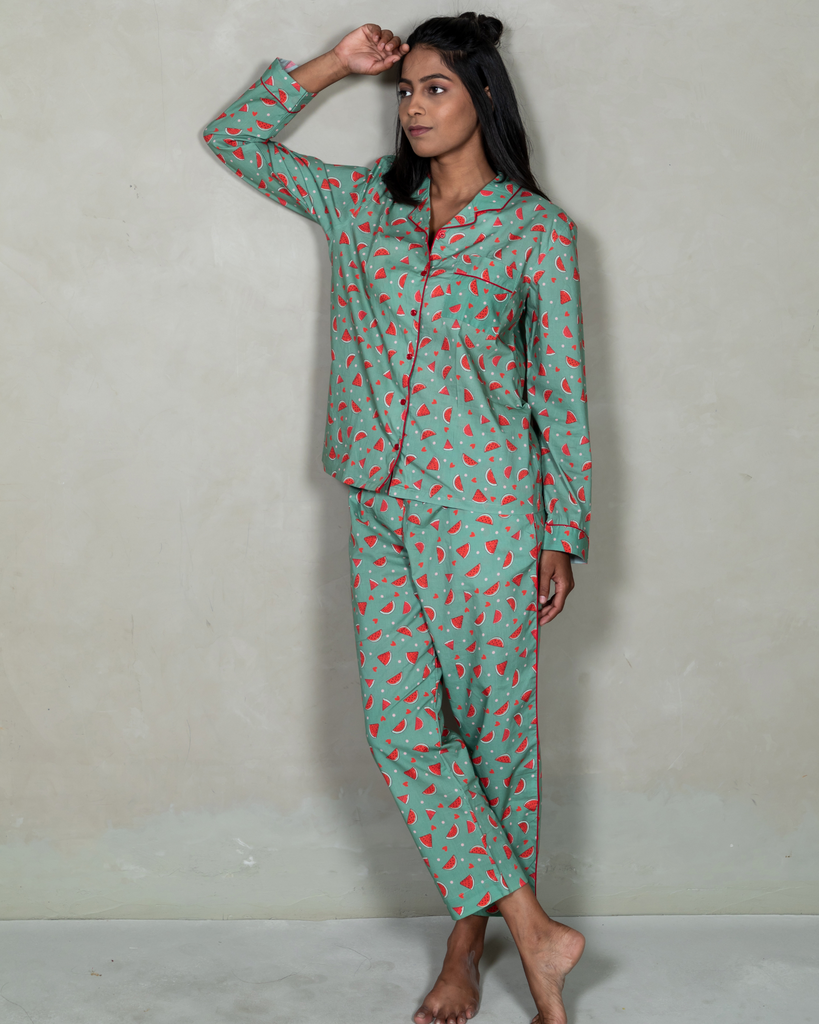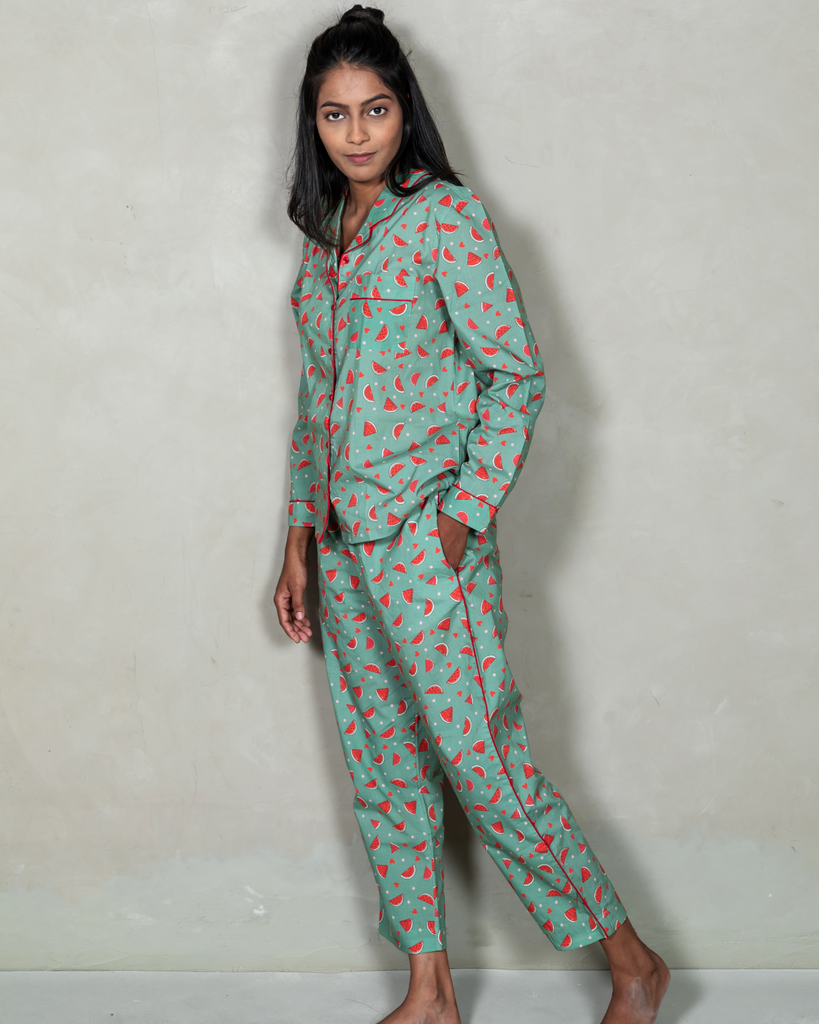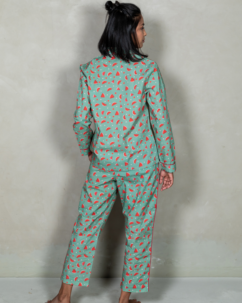 A true wardrobe staple for sleepwear or loungewear, our 'Watermelon Vodka' pyjama set is in 100% premium cotton-poplin fabric. Its comfort fit, premium fabric, unique print and modern style is making this sleepwear more charming.