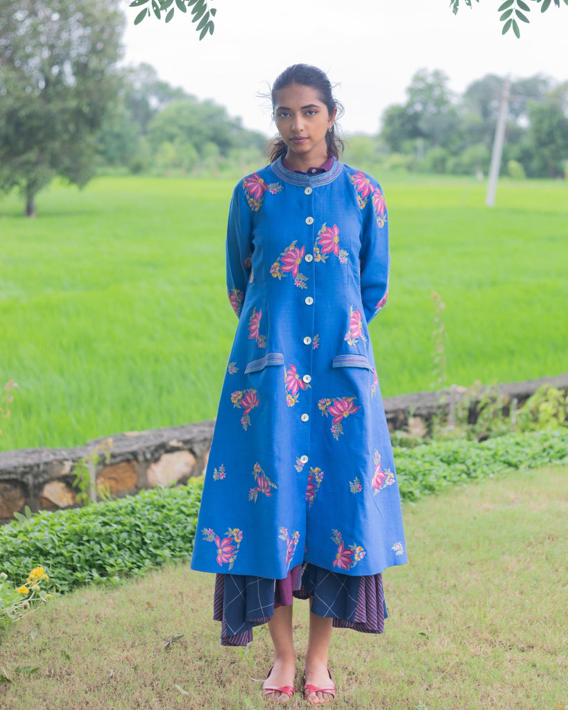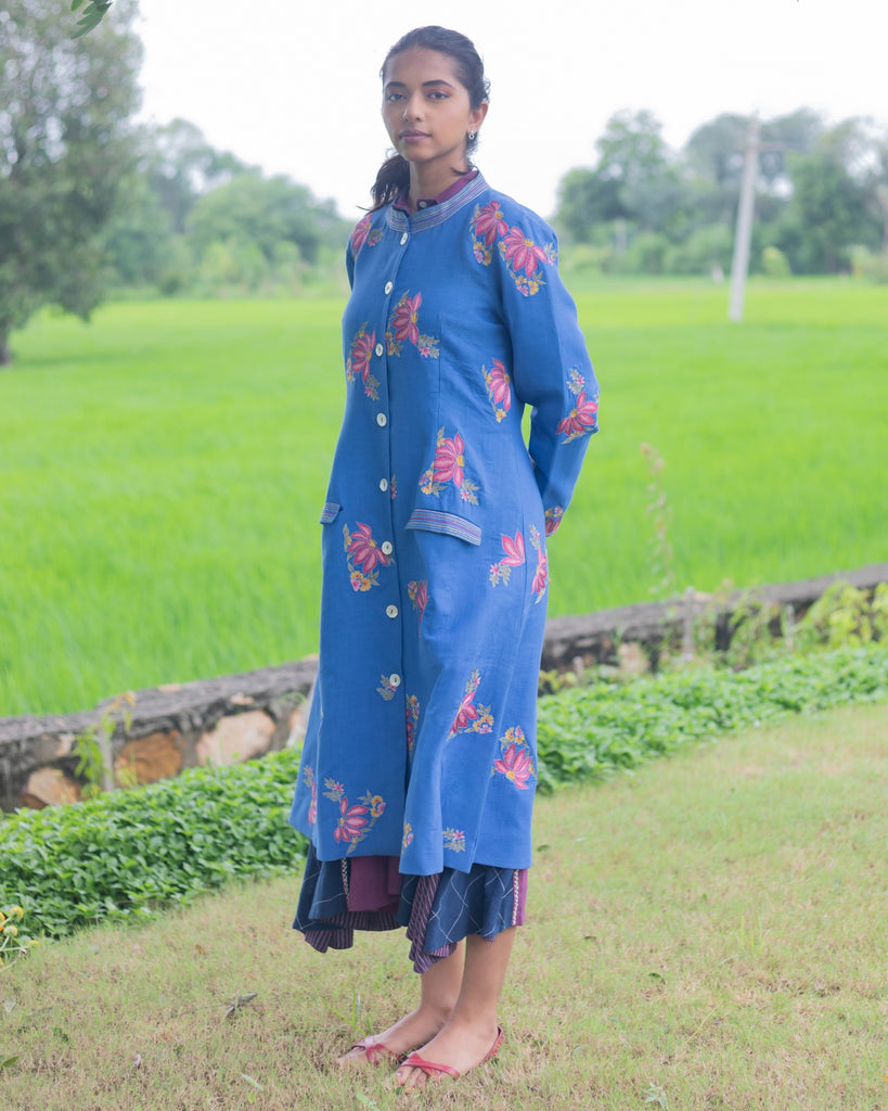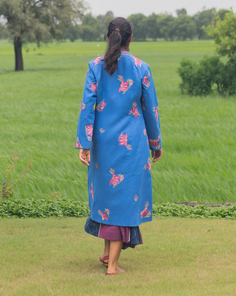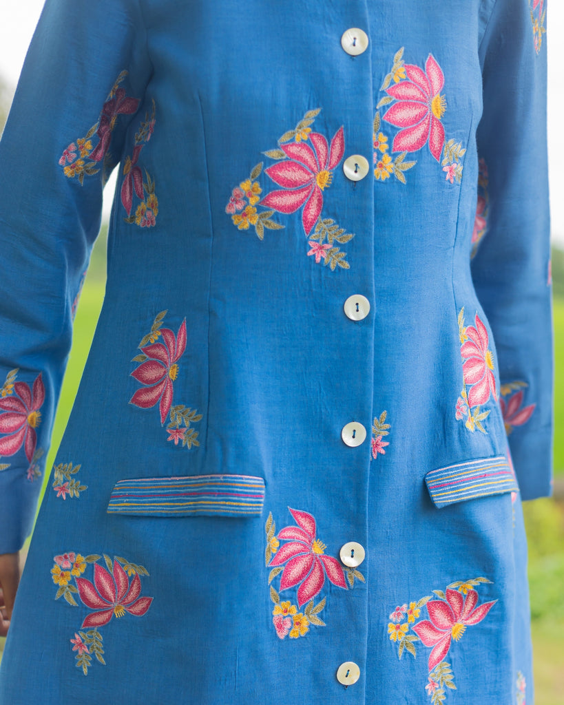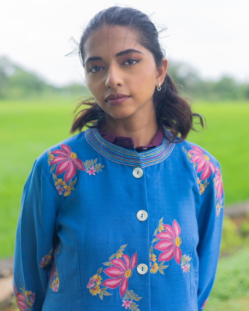 Ocean’s Elegance: Beneath the deep blue of dusk, this tailored jacket blooms with the vibrancy of a thousand flowers. The mandarin collar, full sleeves, and welt pockets bring together form and function, while inside, a lining of striped cotton in serene hues cradles you in comfort. It’s a statement piece for every occasion, from formal meetings to intimate wedding celebrations, perfect when paired with dresses, co-ords, or sarees.
