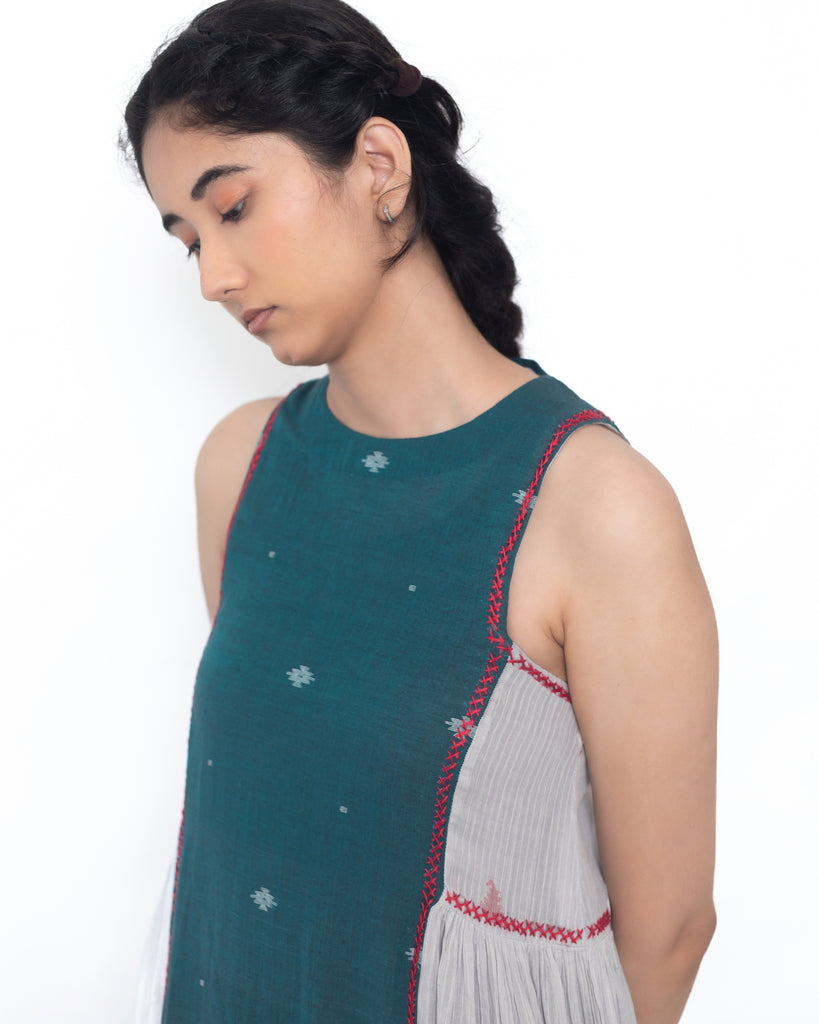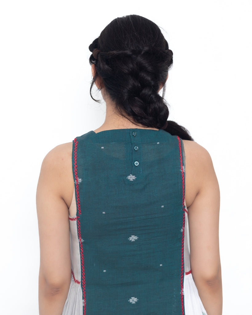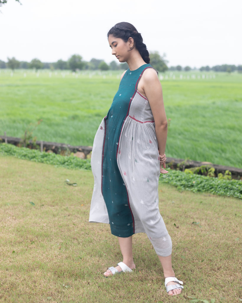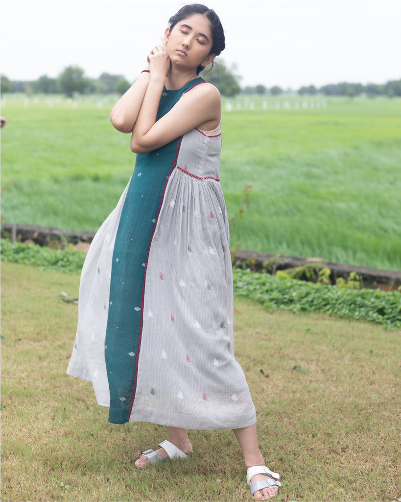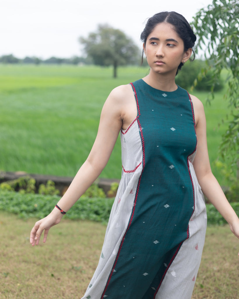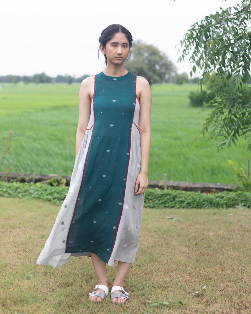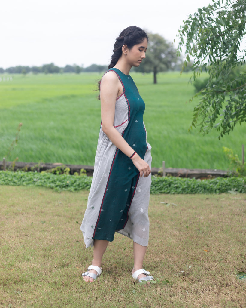 "Whispers of Tradition": Deep green like the forest floor, cool grey like a morning mist—this dress speaks of both the earth and the sky. Panels of heritage Jamdani weaving, stitched together in harmony, are draped with effortless grace. The chevron embroidery adorns the armholes and panels like ethereal brushstrokes, while the high round neck and back opening add a subtle touch of the modern world. It’s a garment as suited for professional poise as it is for leisurely moments.