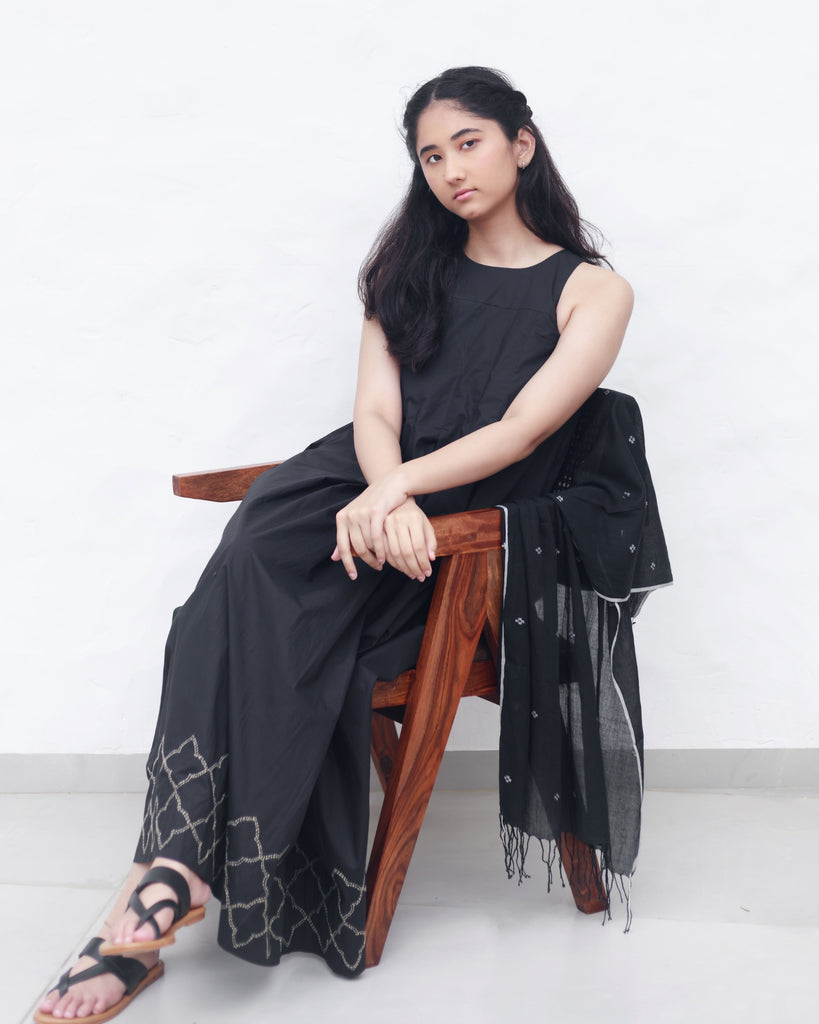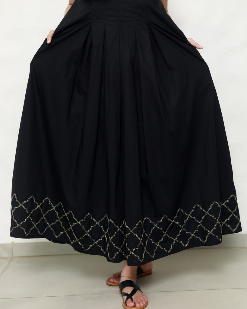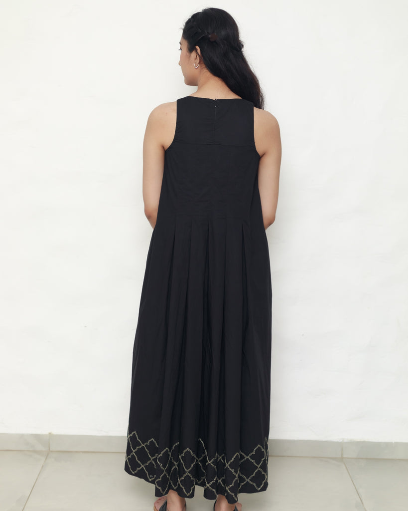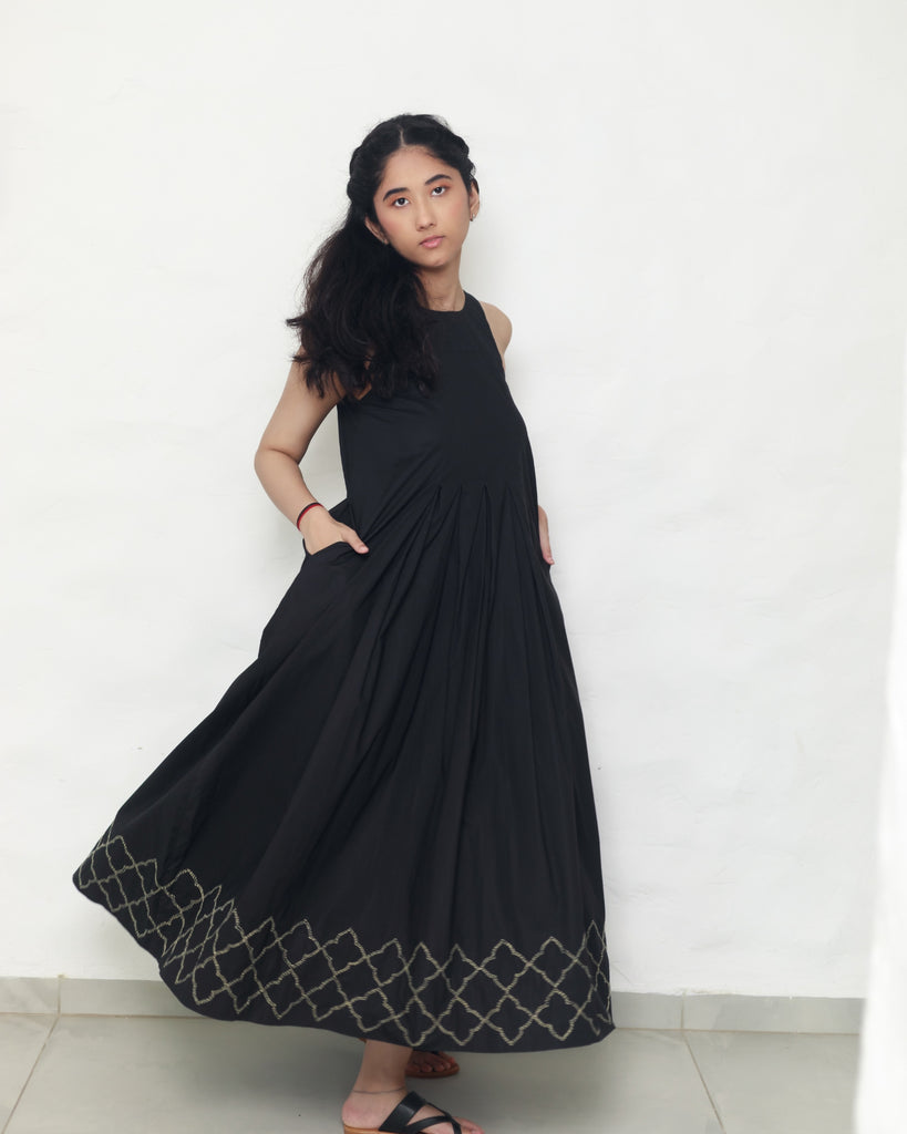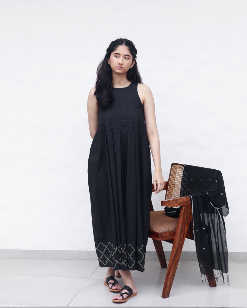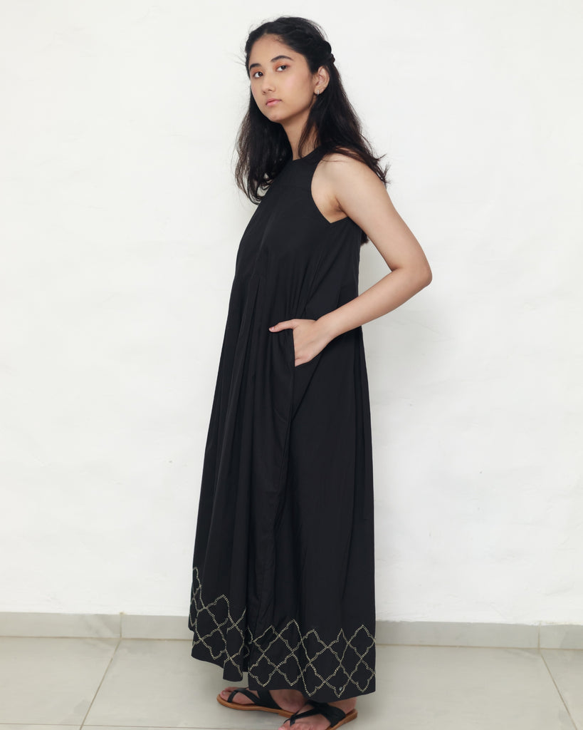 Timeless Elegance in Black: Draped in luxurious black cotton poplin, this sleeveless dress embodies understated elegance. The modern cut speaks in clean lines, with a round neckline and a cascade of gentle pleats unfolding from the waist. The hand-embroidered border at the hemline adds a whisper of artistry, a nod to tradition in a contemporary silhouette. The side pockets blend into the dress's fluidity, making this piece an elegant choice for work, play, or a getaway by the sea.