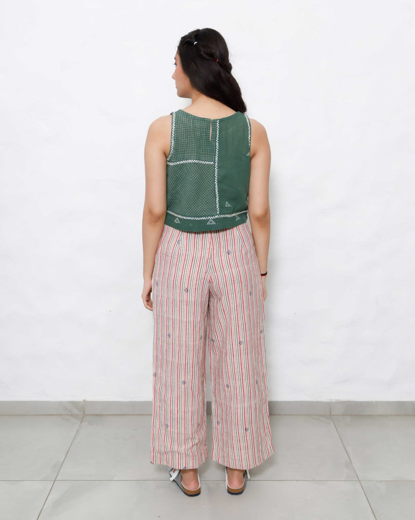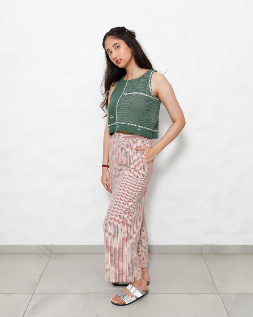 Modern Minimalist Handwoven Co-ord Set: A blend of style and sustainability, this co-ord set includes a fresh green, sleeveless crop top with a contemporary silhouette and multi-textured handwoven fabric. The top is accented with intricate cream chevron embroidery, harmoniously paired with relaxed-fit, high-rise pants in a warm white striped design. The unique weave pattern, concealed zip, and functional pockets make it a versatile choice for any season.