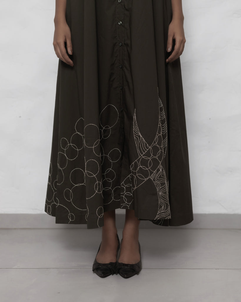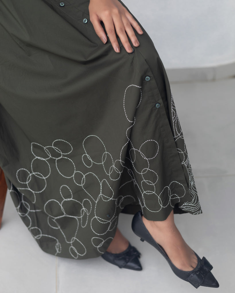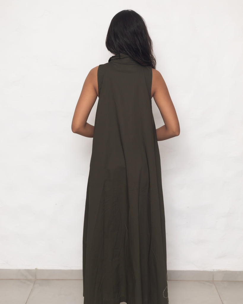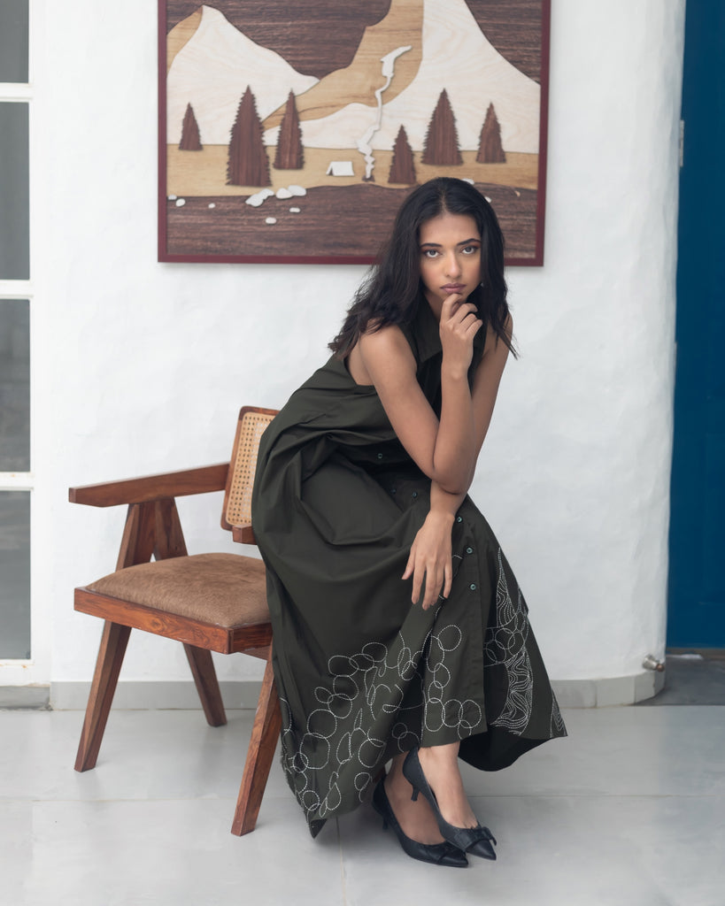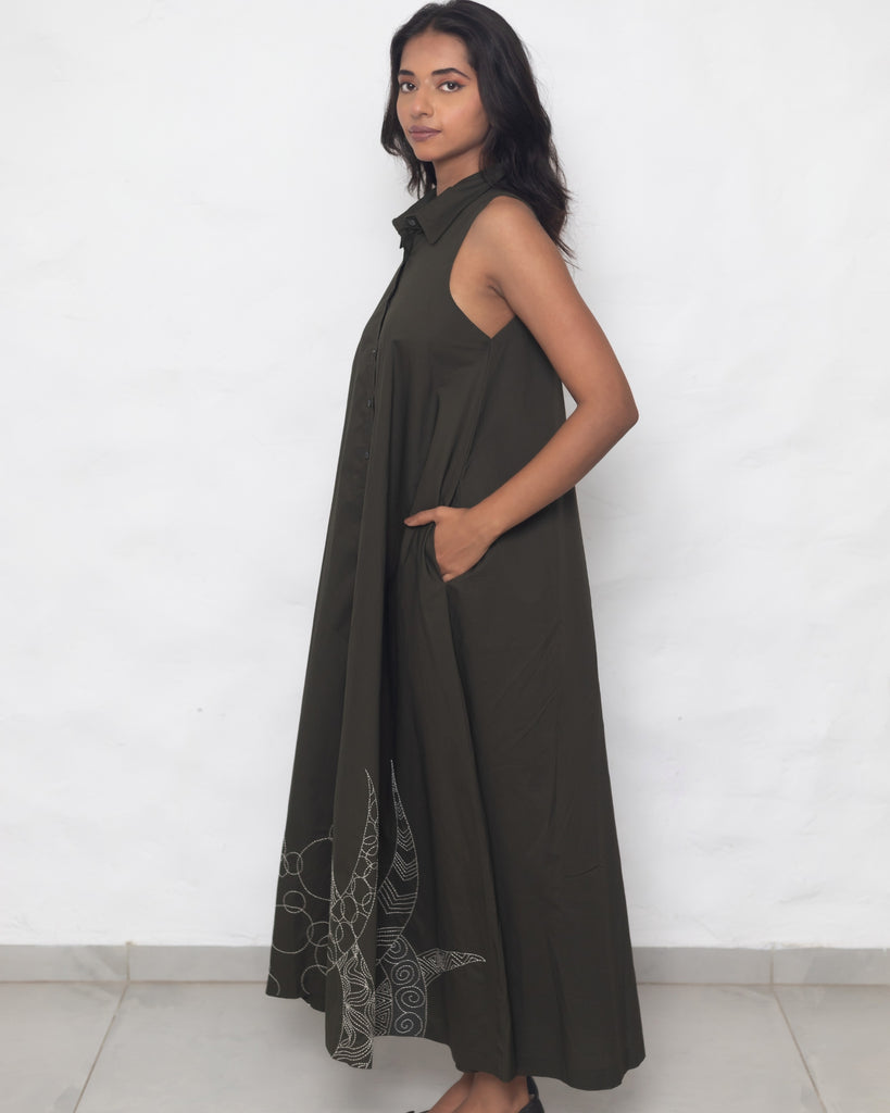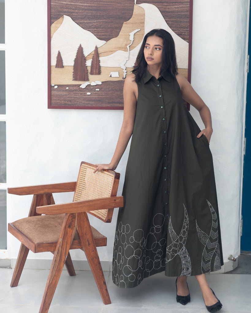 Whispers of Nature: Draped in earthy green, this sleeveless cotton poplin dress dances in the breeze with a modern, minimal A-line silhouette. The shirt collar and front opening lend a casual grace, while delicate hand-embroidered motifs add a touch of contemporary charm to the flowing flair. Functional side pockets enhance its practicality, making it a perfect companion for a laid-back brunch or a business meeting, exuding an effortless blend of style and purpose.