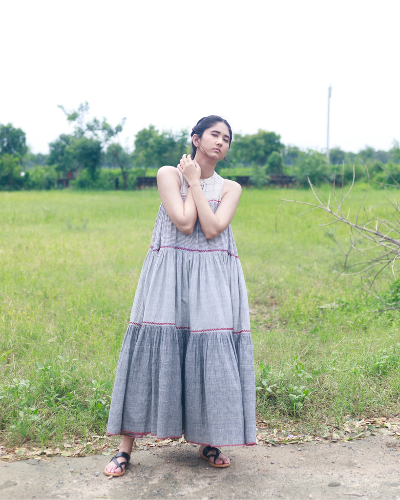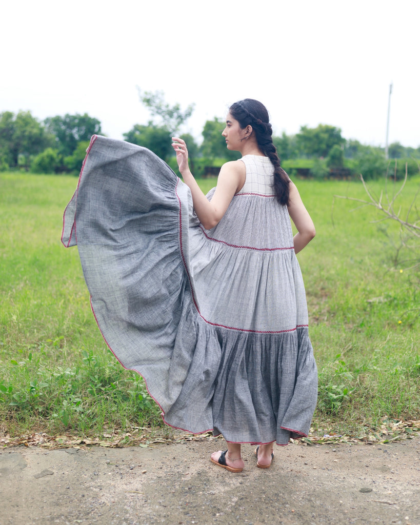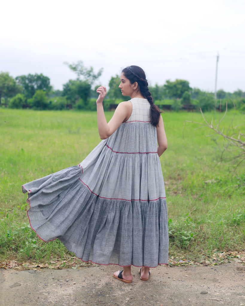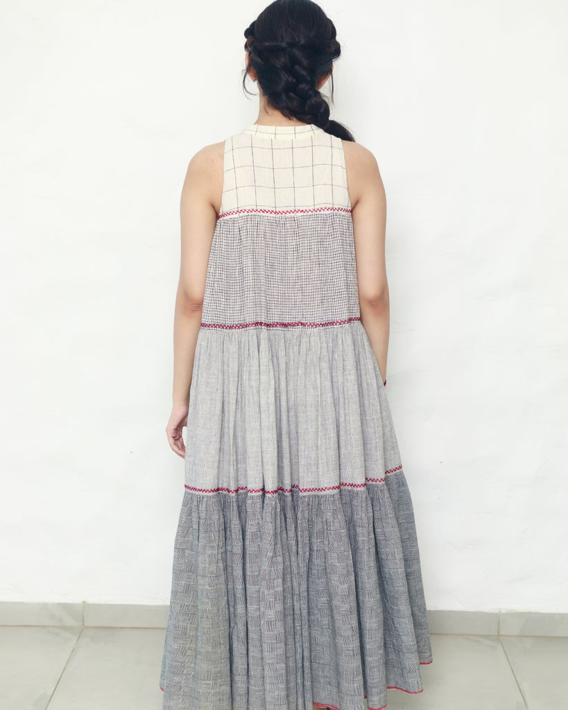 Ethereal Weave: Draped in organic handloom cotton, this dress flows like a gentle breeze, tiered with grace and woven with intricate patterns. Its monochrome palette of cool whites and deep blacks plays with light and shadow, while the modern mandarin collar and placket add sleek sophistication. Hand-embroidered chevron motifs dance on each tier, lending a touch of glamour to its airy form. With pockets for ease and a fit-and-flare silhouette, it's a blend of style and function, perfect for breezy brunches or sunlit meetings.