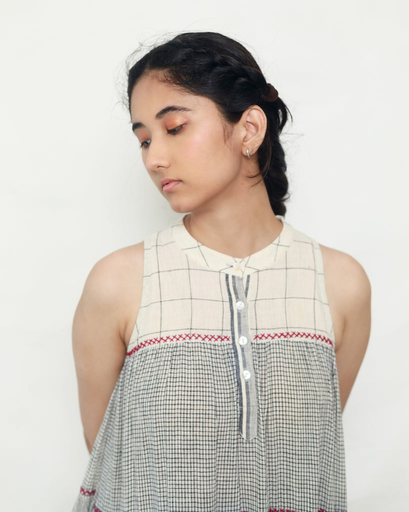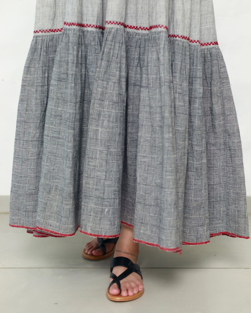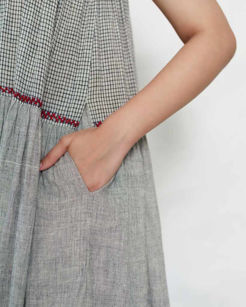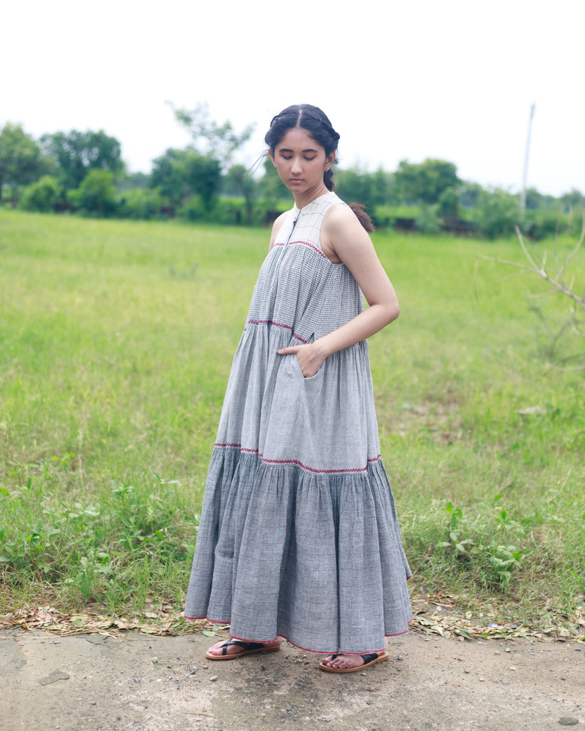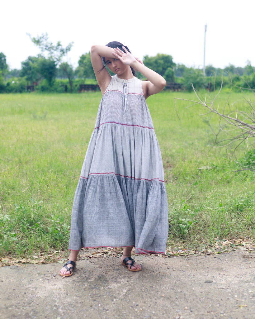 Ethereal Weave: Draped in organic handloom cotton, this dress flows like a gentle breeze, tiered with grace and woven with intricate patterns. Its monochrome palette of cool whites and deep blacks plays with light and shadow, while the modern mandarin collar and placket add sleek sophistication. Hand-embroidered chevron motifs dance on each tier, lending a touch of glamour to its airy form. With pockets for ease and a fit-and-flare silhouette, it's a blend of style and function, perfect for breezy brunches or sunlit meetings.