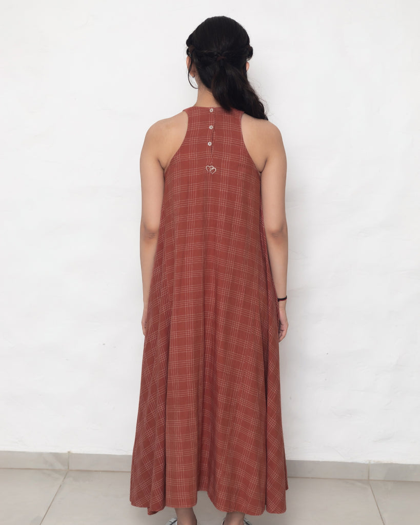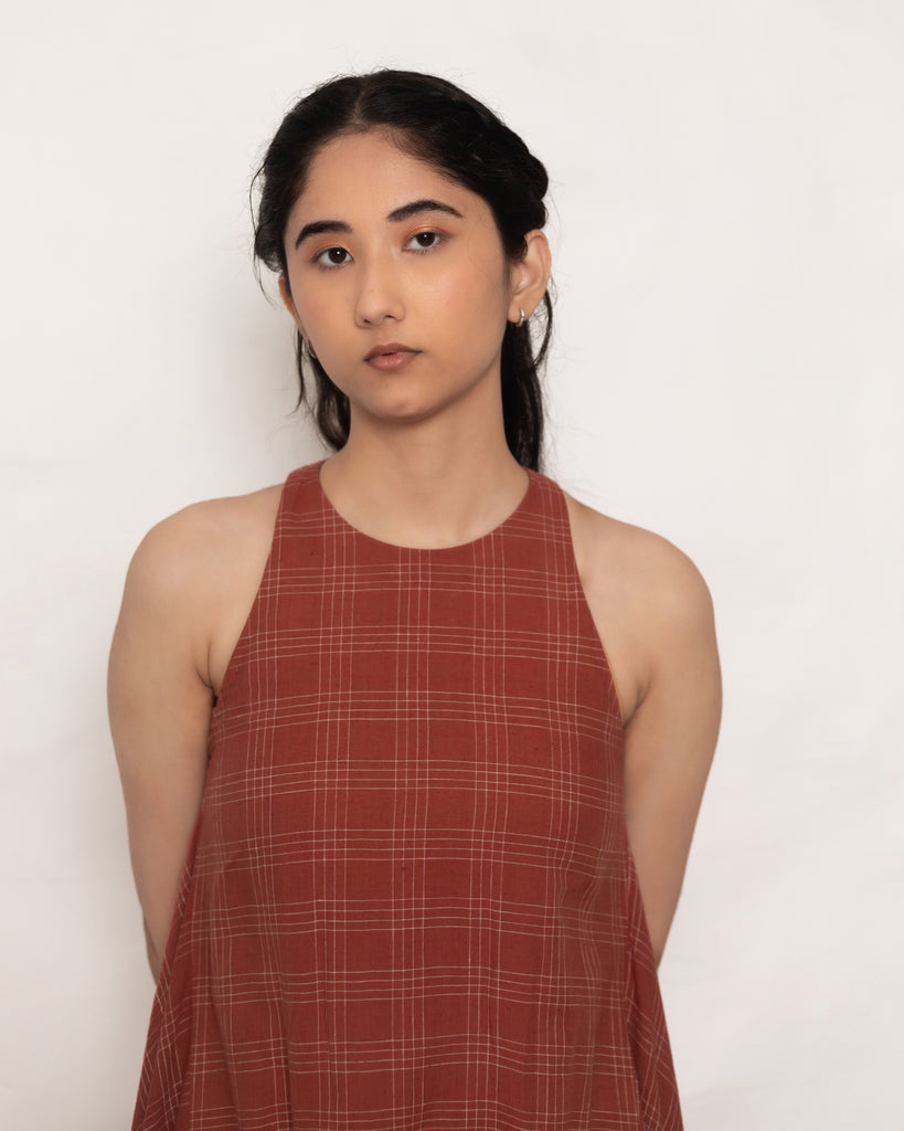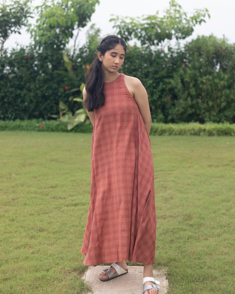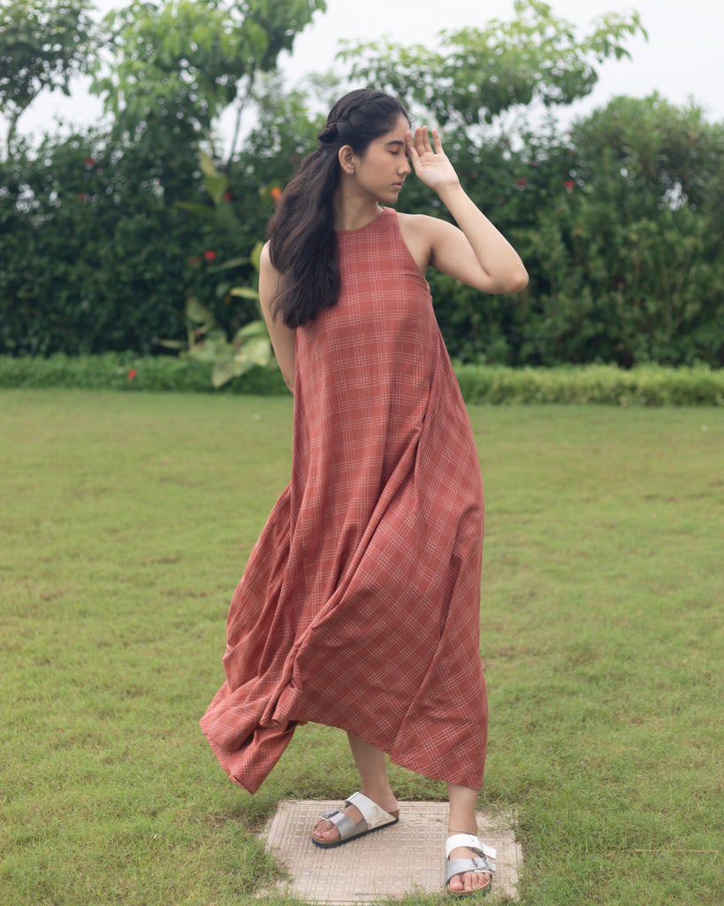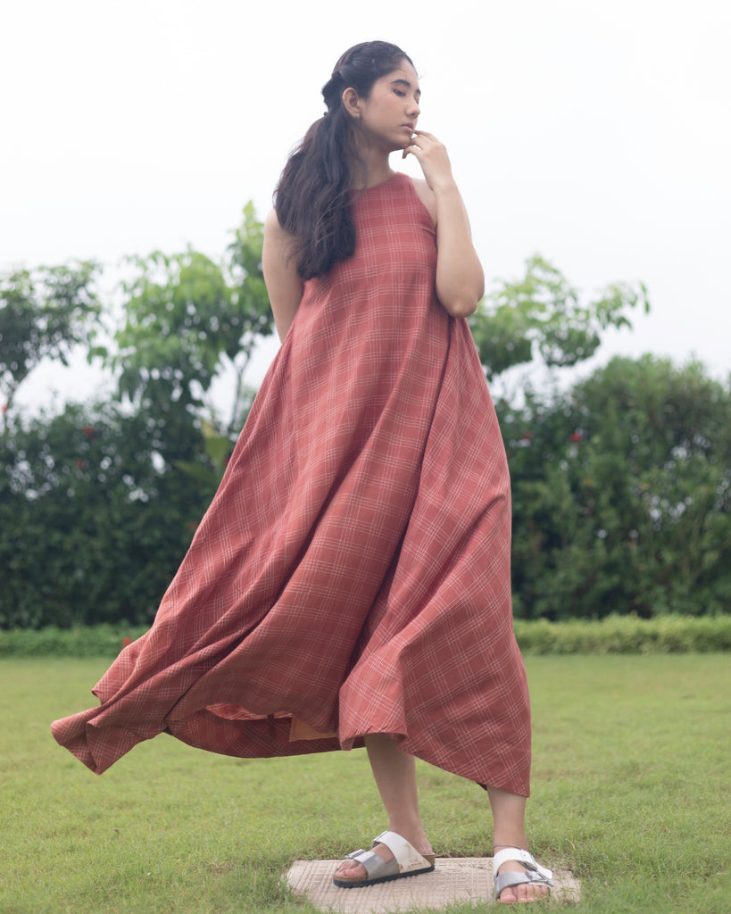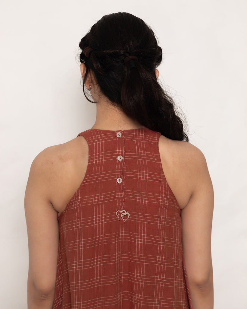 Rosewood Reverie: In a palette as soft as dawn, this trapeze dress of hand loomed cotton catches the eye with its checkered weave and flowing silhouette. The sleeveless cut adds a hint of summer, while diagonal side panels create a modern, architectural beauty. Embroidered hearts rest quietly at the back, a touch of whimsy for the woman ready for brunch, a business meet, or a coastal escape.