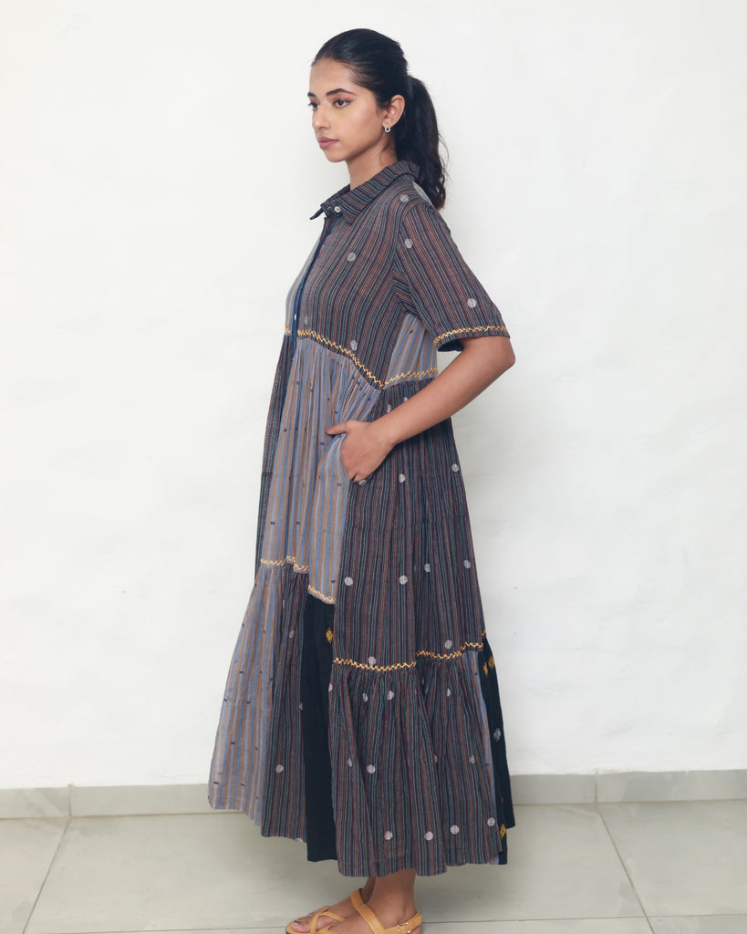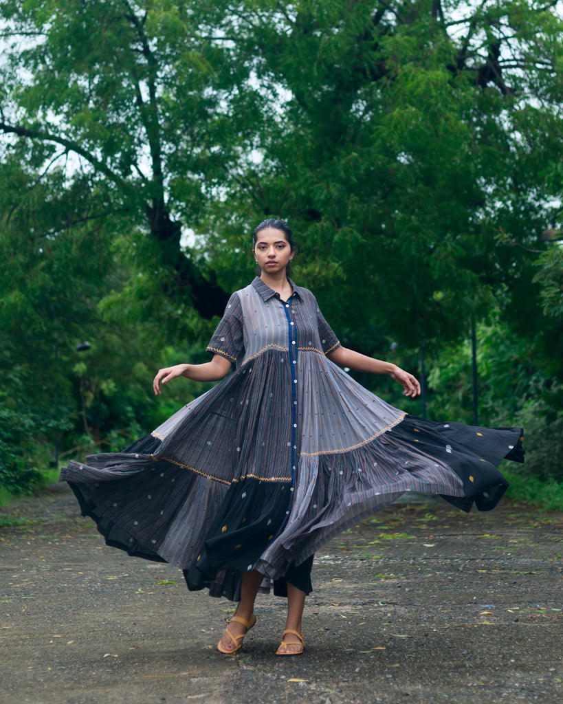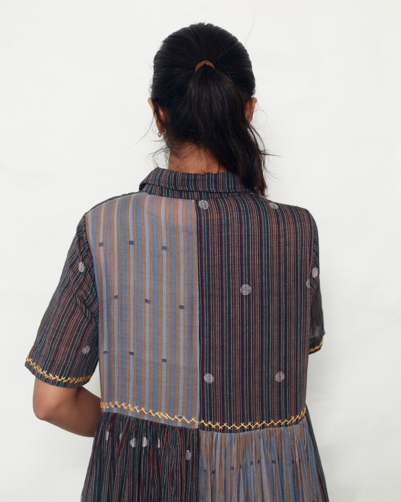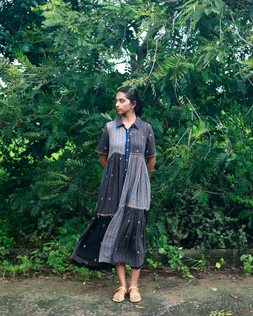 Windswept Weaves: A breath of heritage in every thread, this handloom Jamdani dress merges geometric weaves with a flared, tiered silhouette. The airiness of the cotton fabric is matched by the elegance of Chevron embroidery, tracing soft patterns on the sleeves and tiers. A structured shirt collar meets an easy front opening, making this dress the perfect companion for meetings, sunny brunches, or a breezy vacation.