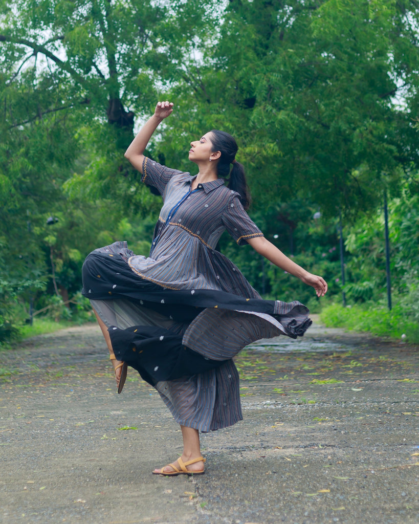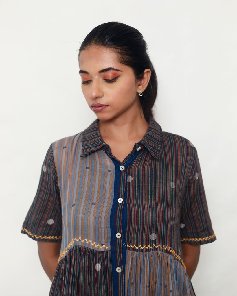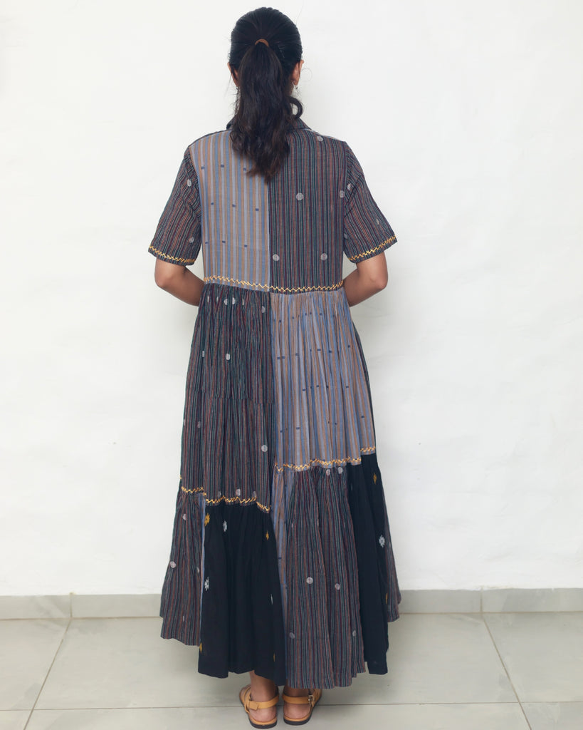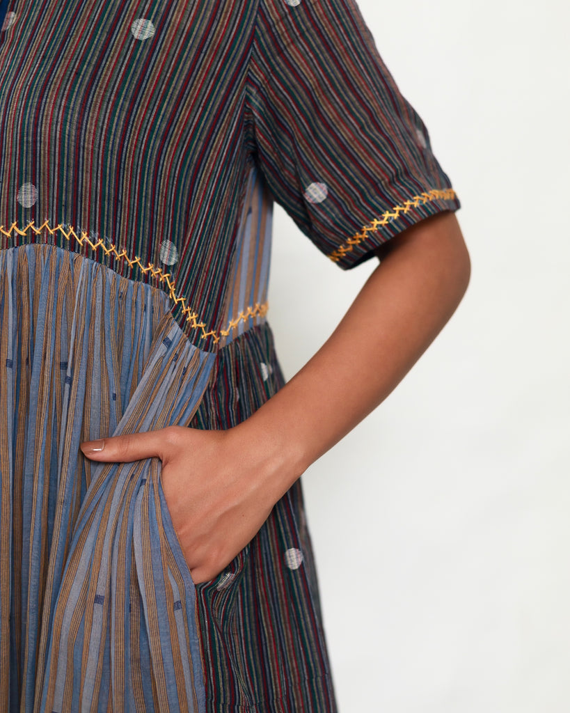 Windswept Weaves: A breath of heritage in every thread, this handloom Jamdani dress merges geometric weaves with a flared, tiered silhouette. The airiness of the cotton fabric is matched by the elegance of Chevron embroidery, tracing soft patterns on the sleeves and tiers. A structured shirt collar meets an easy front opening, making this dress the perfect companion for meetings, sunny brunches, or a breezy vacation.