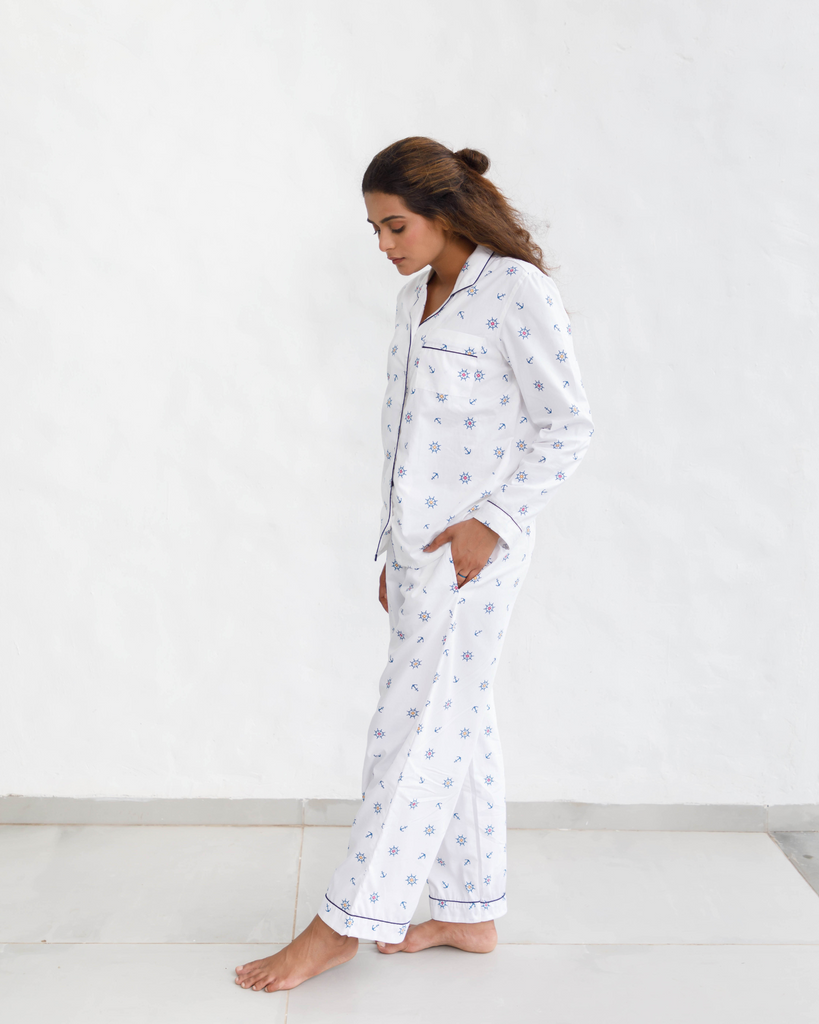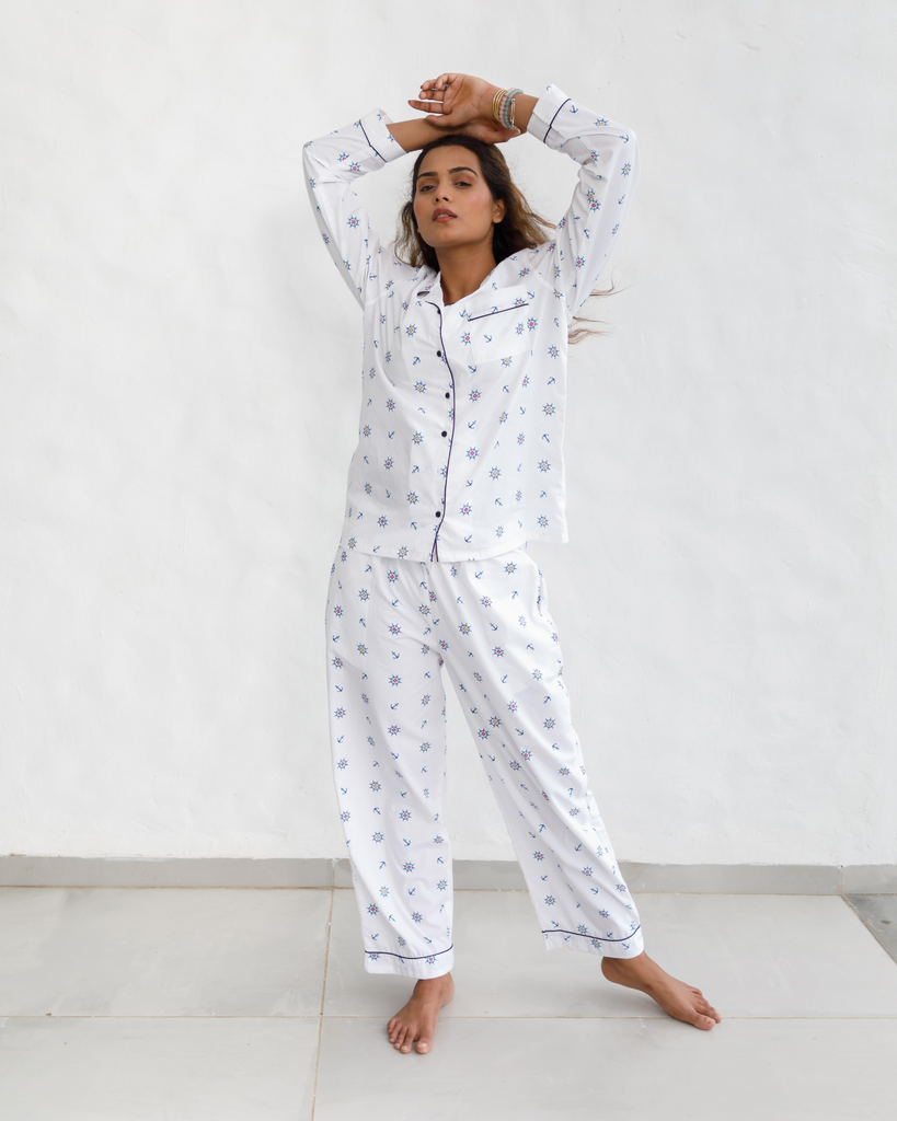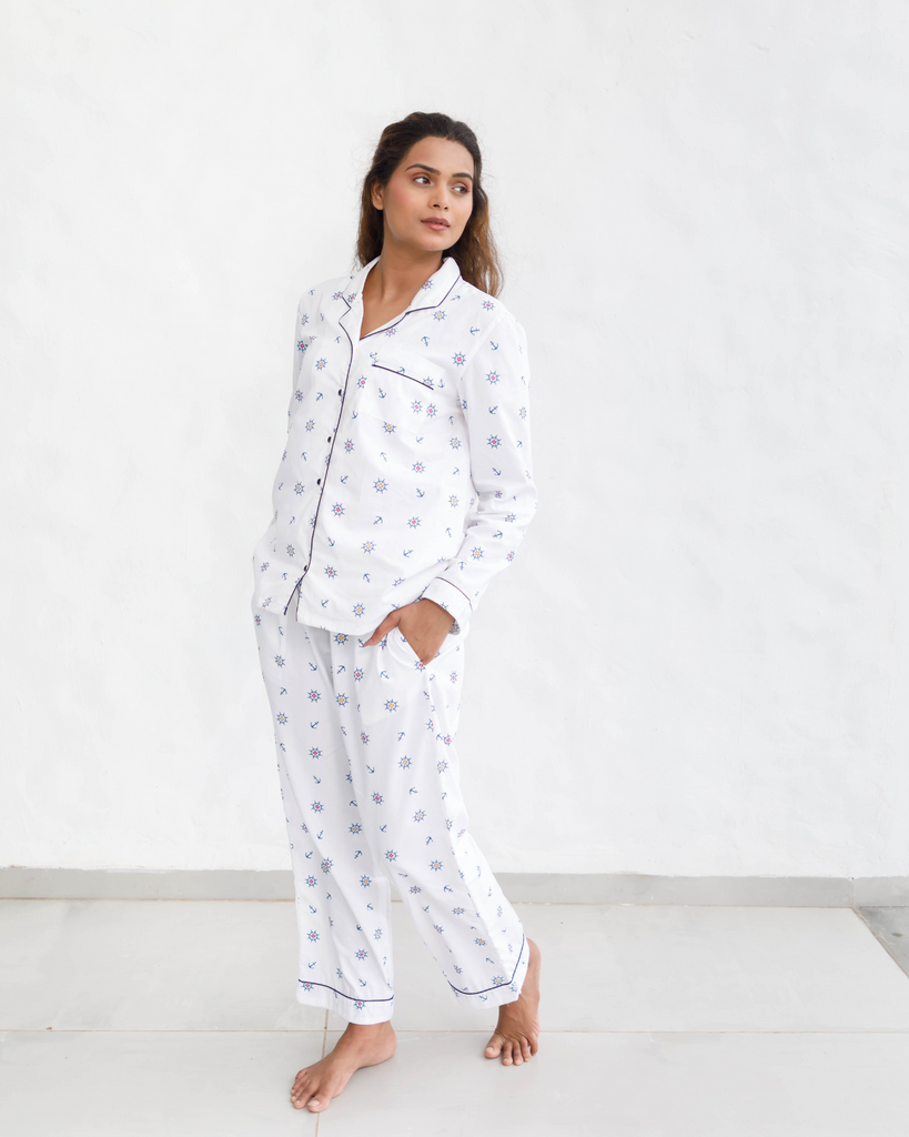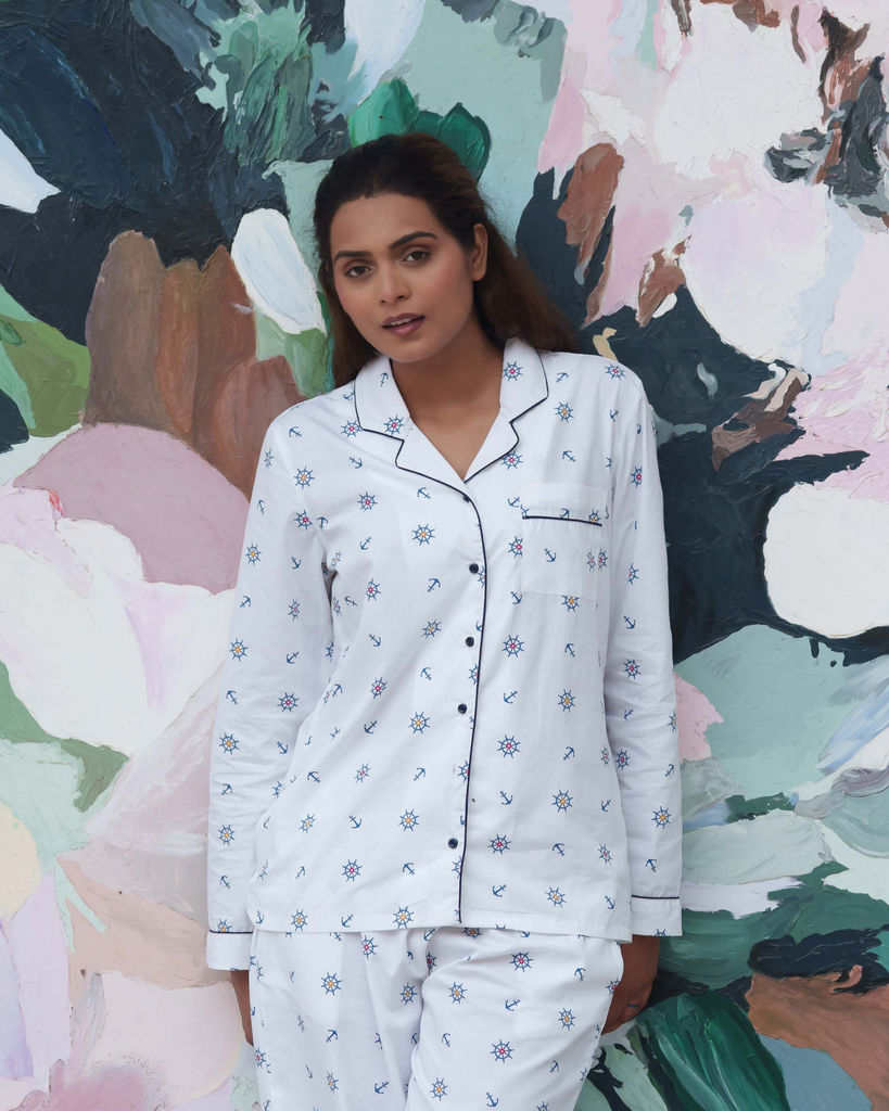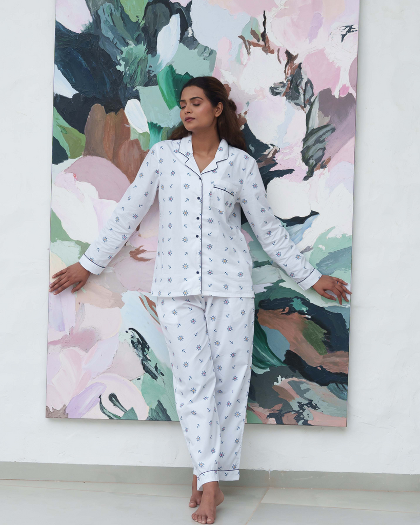 Cute anchor sign in light colour palette, is adding a little charm to your sleepwear collection. Premium poplin fabric, notched collar and monogrammed options are elevating beauty of this sleepwear. So what are you waiting to throw a slumber party in this pyjamas?