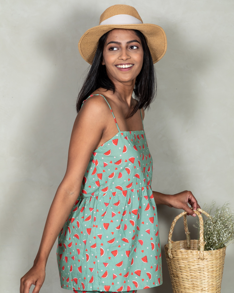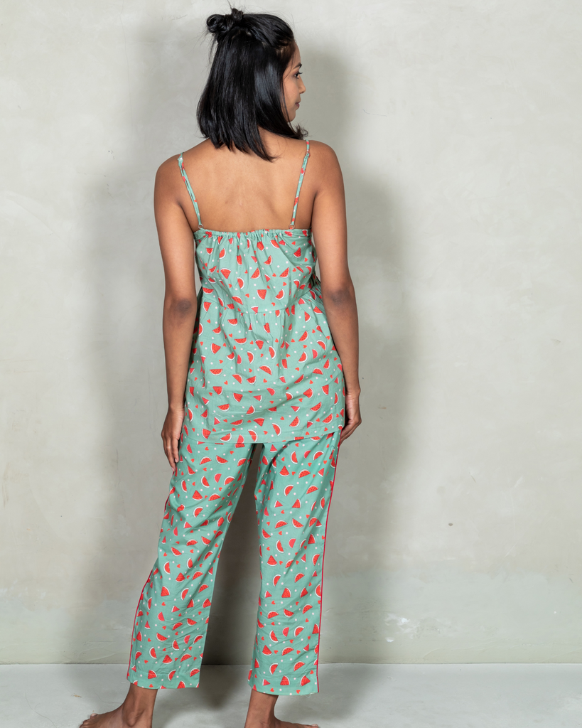 Inspired by summer season celebrations, our 'Watermelon Vodka' pyjama set is a must. We design top of the set in camisole and bottom in a bit tapered fit with ankle length to give a modern look. Comfort,relaxed fit and 100% pure poplin fabric will keep you clam in hot summer season.