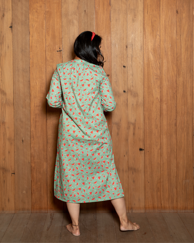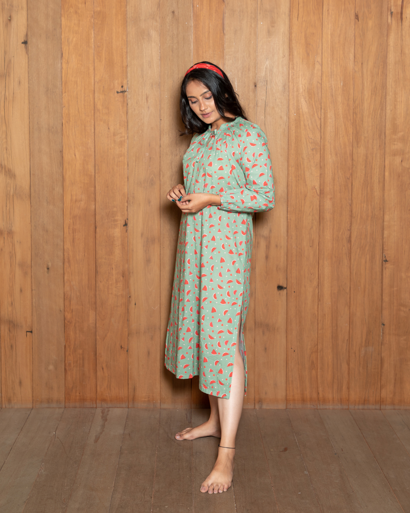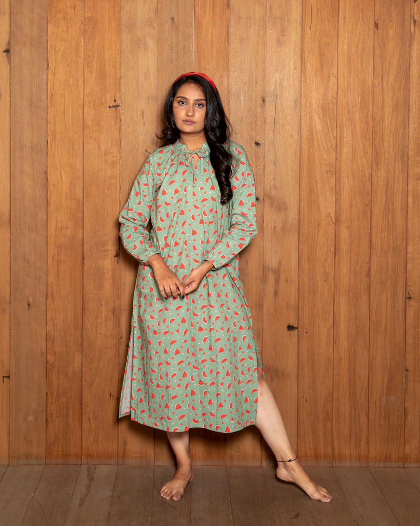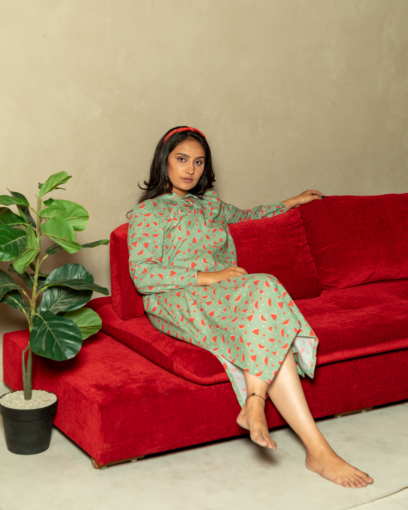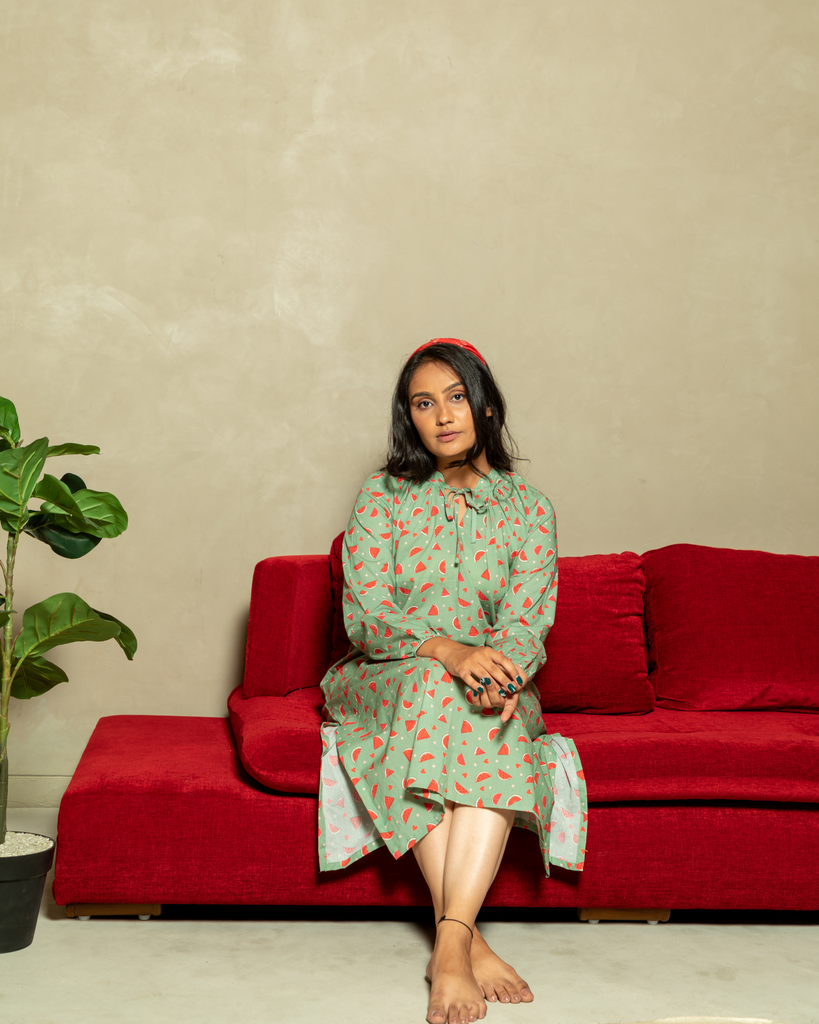 A true wardrobe staple for loungewear or small gathering at home, Bluenight's watermelon vodka dress is in 100% premium cotton-poplin fabric. Delicate gathering details with tying bow details at neck and side slits at flare will keep you relaxed and comfortable while you are lounging indoors.
