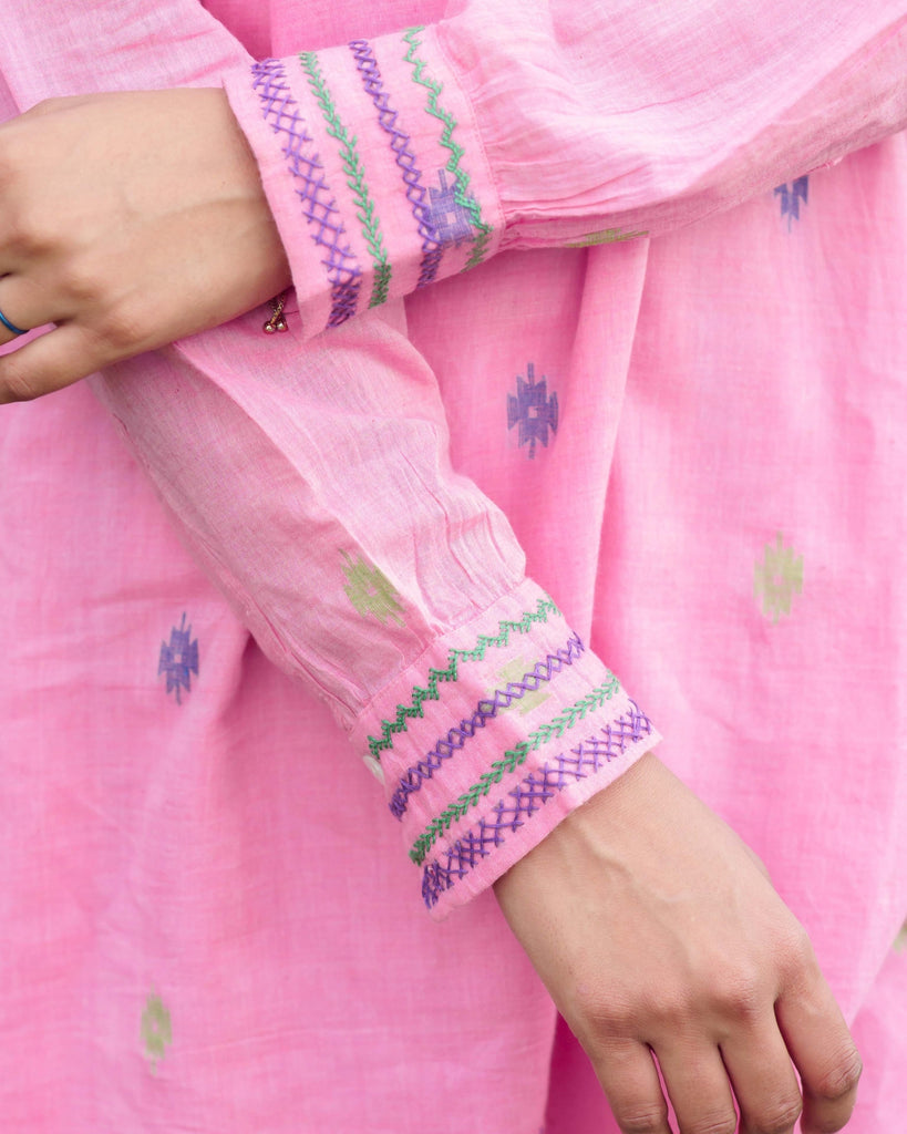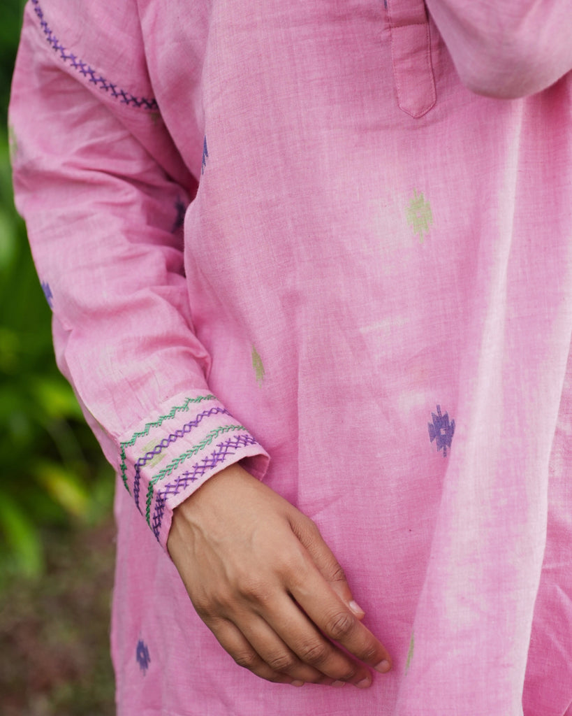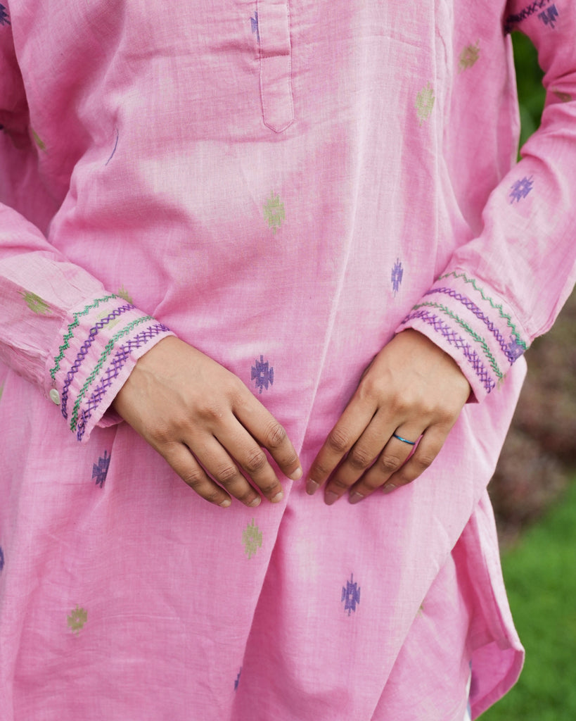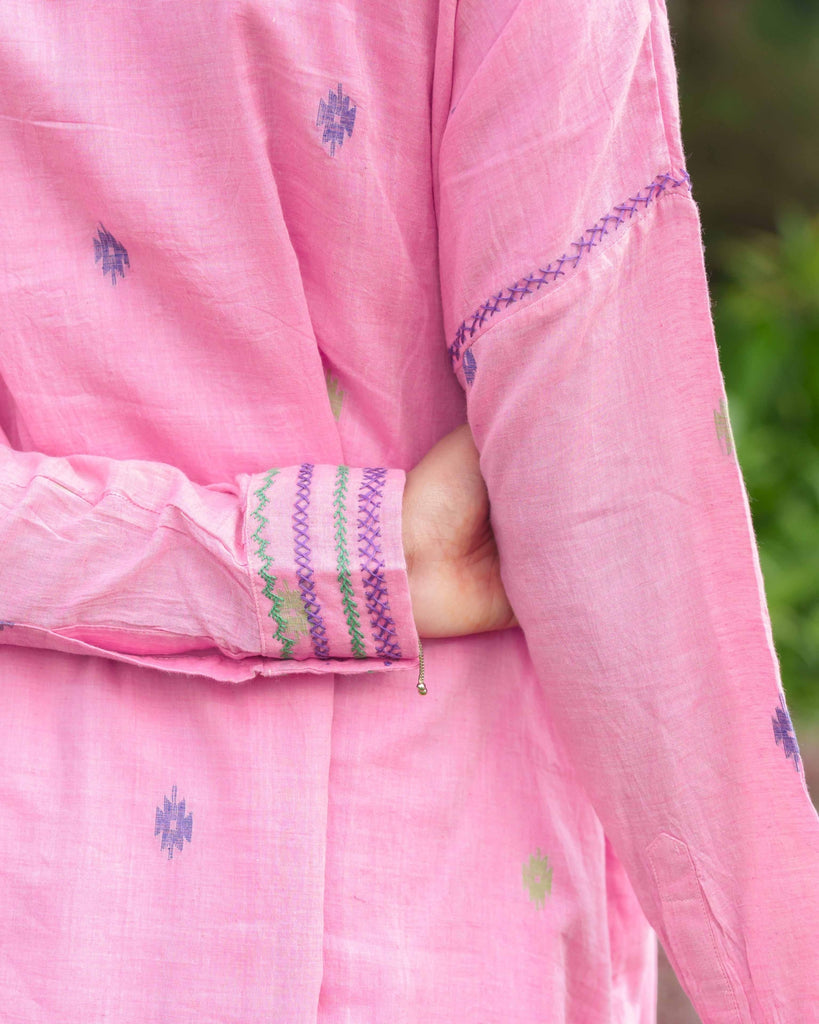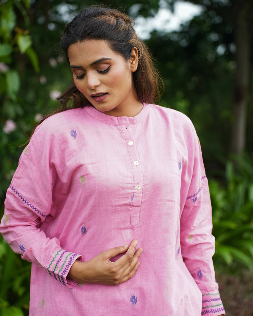 A Bloom in Pink: Woven with whispers of tradition, this bright pink tunic crafted from handwoven Jamdani fabric tells a story of grace and ease. Its dropped shoulder silhouette flows effortlessly, while the mandarin collar and placket add a refined touch. The soft cotton mulmul lining ensures comfort, and intricate hand embroidery on the armholes and sleeve cuffs brings a quiet beauty to the piece. Whether matched with jeans for a casual day out or tailored pants for a sophisticated work look, this tunic is a timeless ode to elegance.