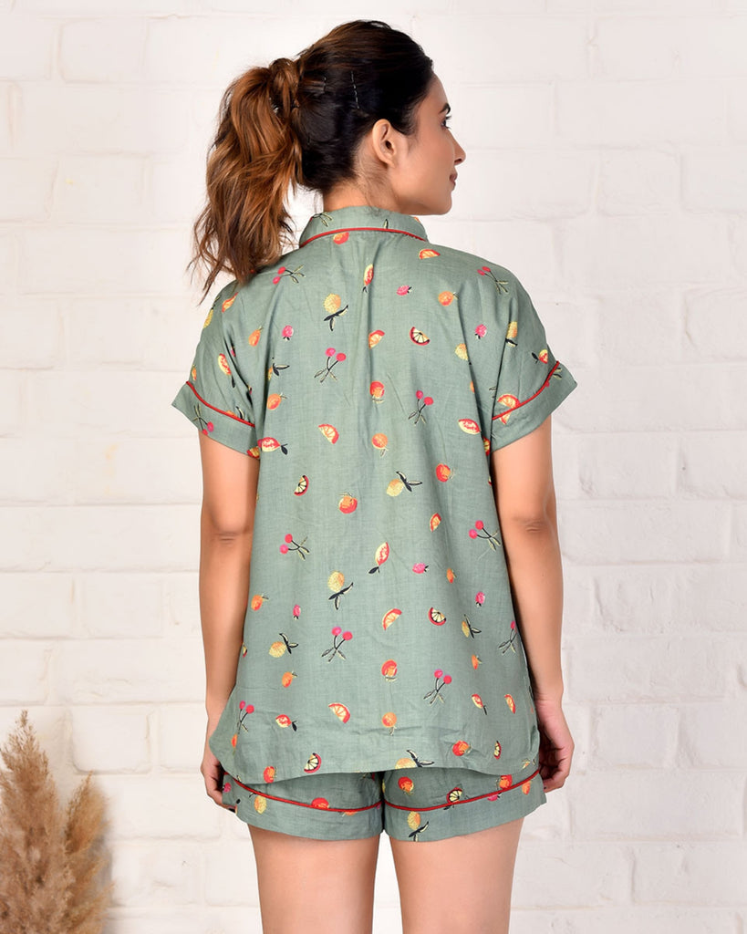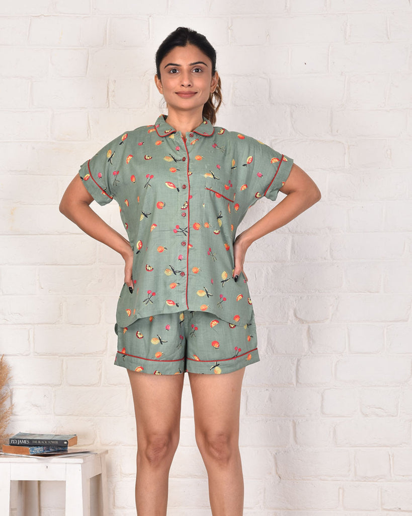 This Citrus Fruit shorts set is designed with comfort and style in mind. Boasting a bright and cheerful fruity print, this sleepwear set is perfect for cozy evenings at home. Crafted from soft and lightweight material, this shorts set is sure to make slipping into relaxation mode a breeze.