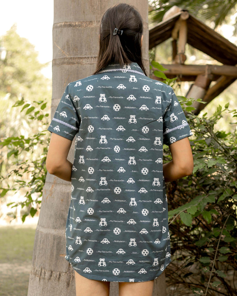 Inspired by childhood memories, this sleep dress has fun & quirky motifs on it. Crafted from 100% premium cotton-poplin fabric, this shirt dress will keep you relaxed while you are lounging indoors.