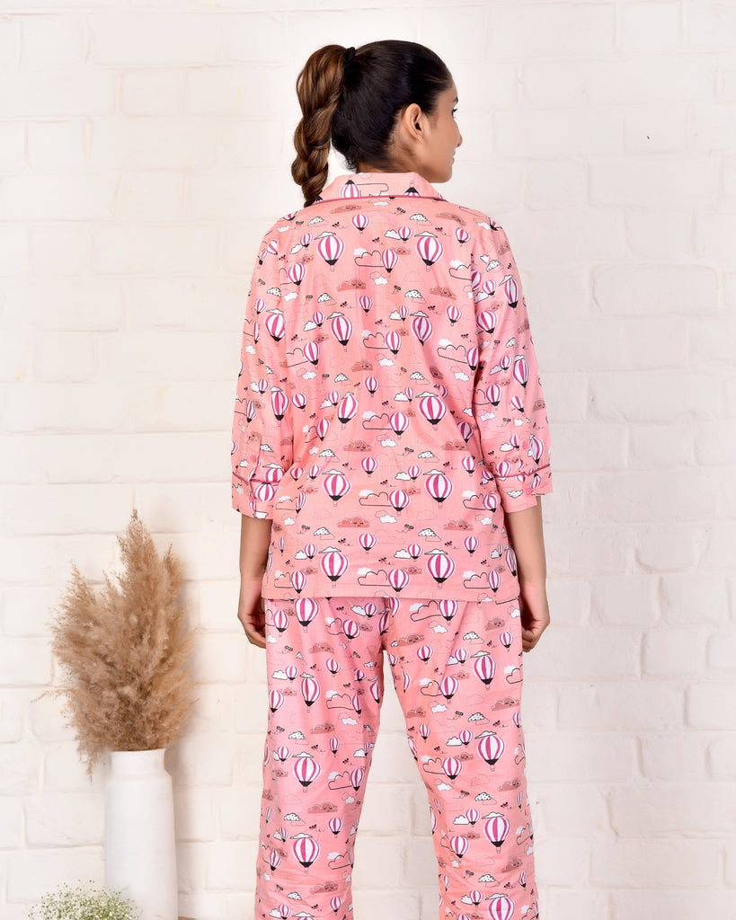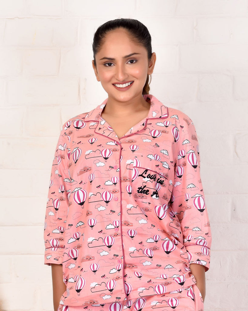 Bring summer into your wardrobes with our quirky prints where our latest sleep edition speaks of sleep in classic and timeless silhouettes that are great to wear all year round. This signature notched collar pyjama set comes as a tailored fitting shirt with lapels, a chest pocket & contrast coloured cording paired with a relaxed fitting pyjama. inspired by a summer season making it a must have fun set you're going to love!