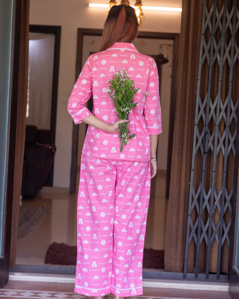This cozy pink colored pyjama set is the perfect way to relax and unwind after a long day. The charming unique print will take you back to days of childhood and make bedtime a fun time. Crafted with comfort and style in mind, the set is made of 100% cotton and is designed with your relaxation in mind. Snuggle up in the Childhood Memories pyjama set and drift off in no time!