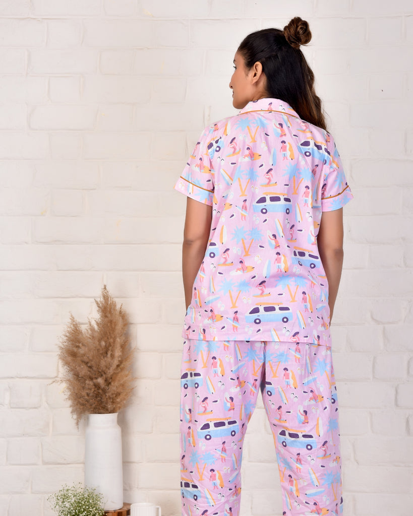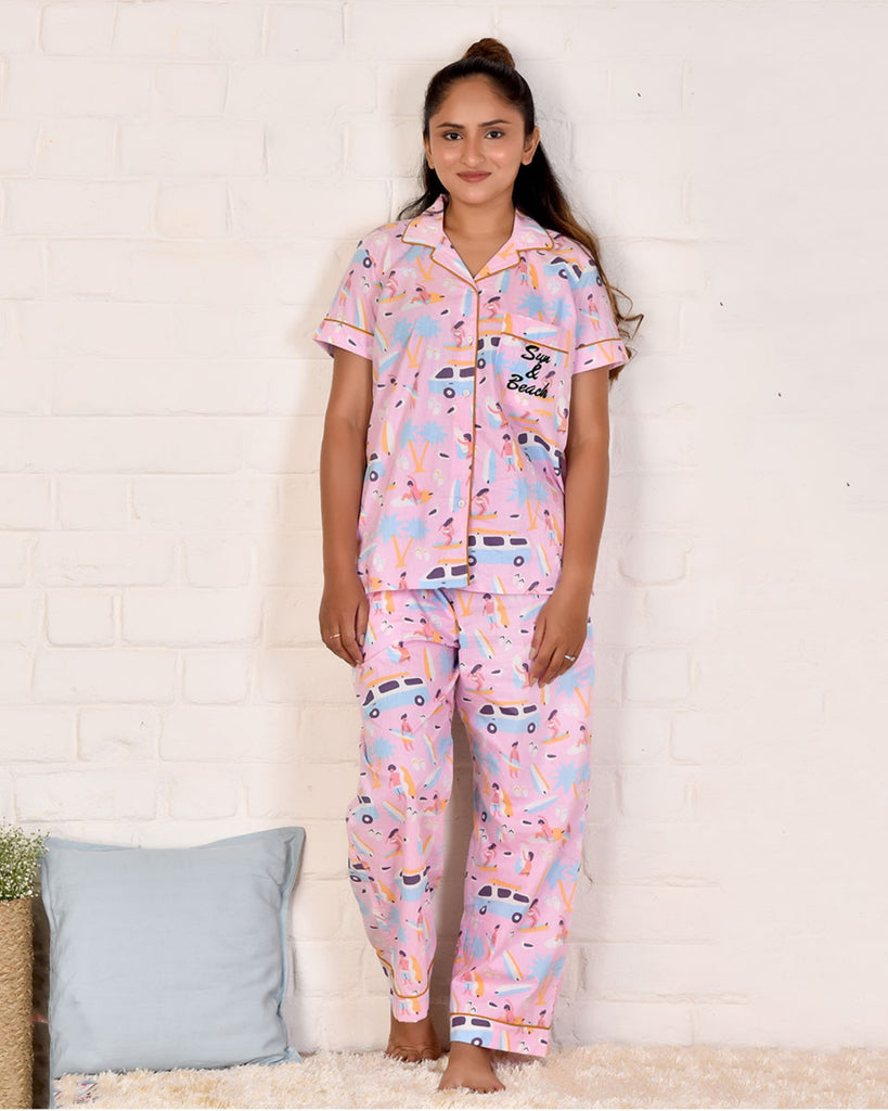 Bring summer into your wardrobes with our quirky prints where our latest sleep edition speaks of sleep in classic and timeless silhouettes that are great to wear all year round. This signature notched collar pyjama set comes as a tailored fitting shirt with lapels, a chest pocket & contrast coloured cording paired with a relaxed fitting pyjama. inspired by a summer season making it a must have fun set you're going to love!
