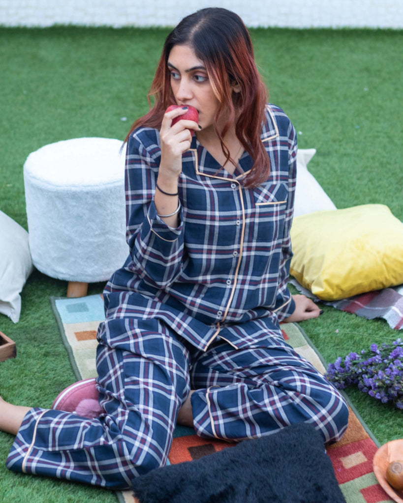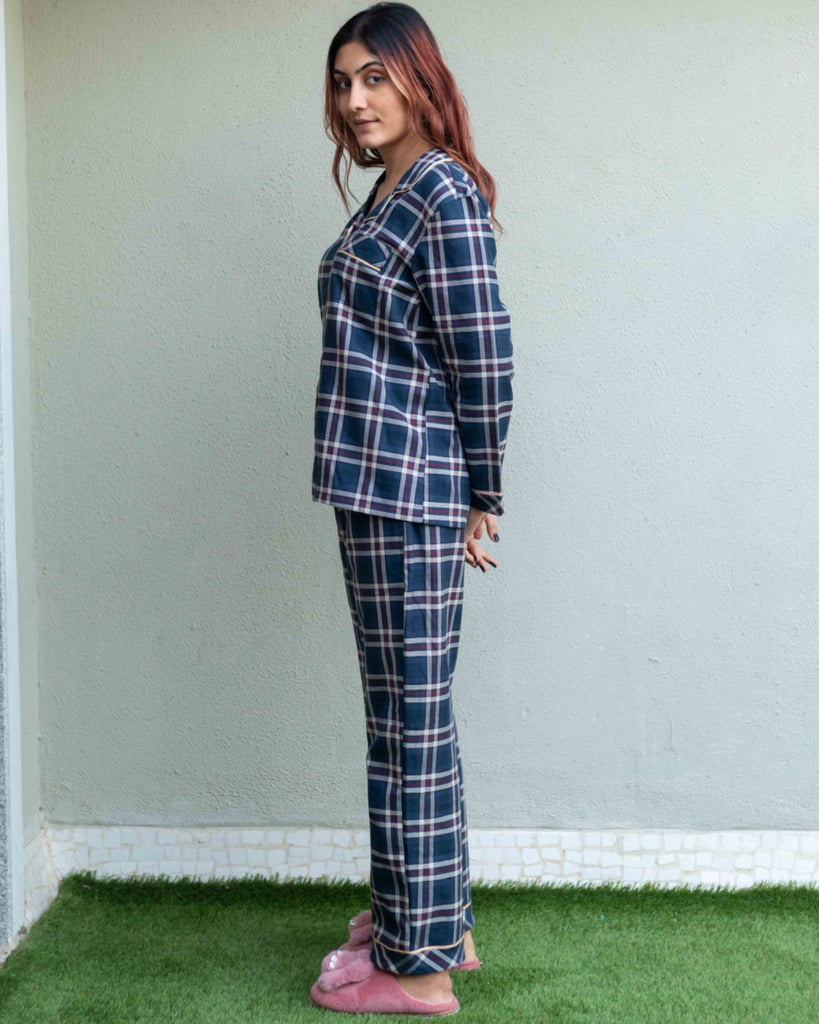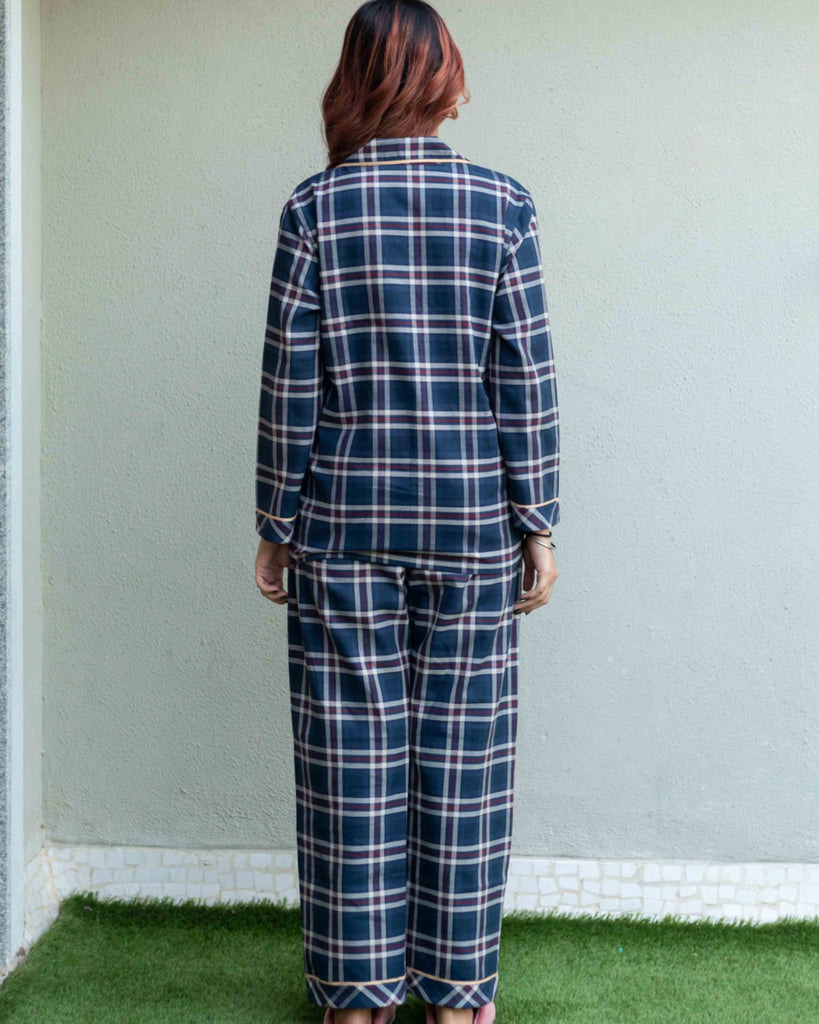This signature notched collar comes as a classic checkered pattern lapel,button down shirt in breathable flannel fabric. In hues of navy, crimson and almond beige our 'Cinnamon Bread' notched collar pyjama set comes in a relaxed fit with its two-part coordinated pyjama set and contrasted details. This sleepwear gives you comfort and coziness in chilling winter season.