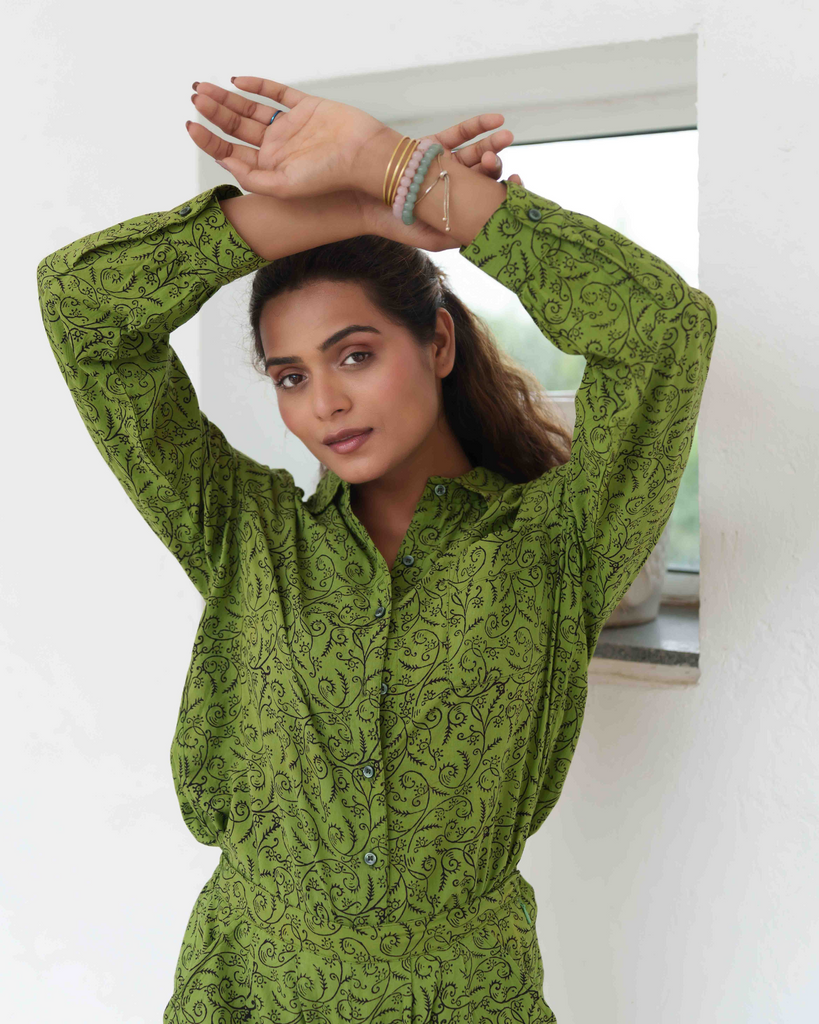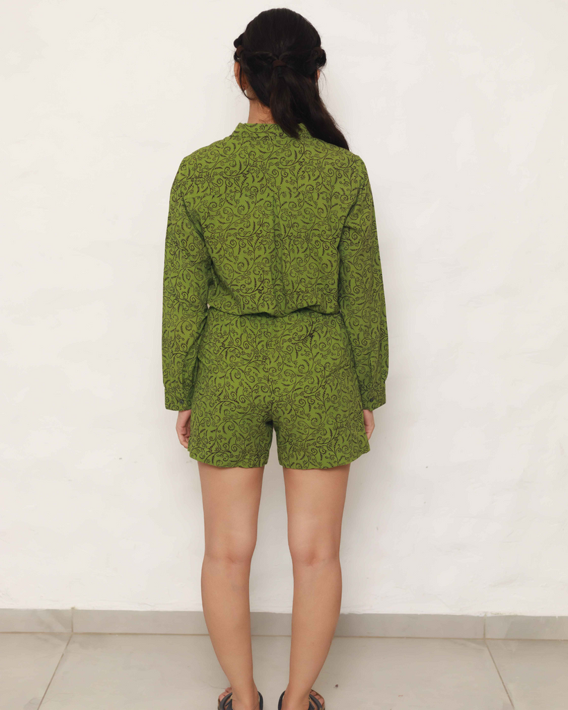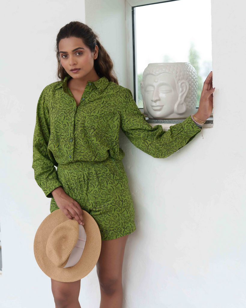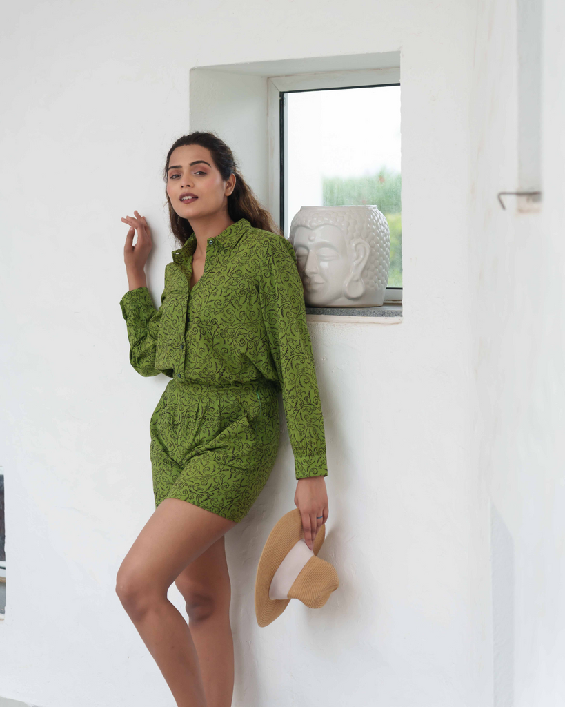 Discover the essence of slow fashion with our natural dye, block-printed shirt, and high-waisted shorts set. The classic shirt offers a refined silhouette, while the matching shorts add a modern edge, making this outfit ideal for travel adventures and leisurely days alike.