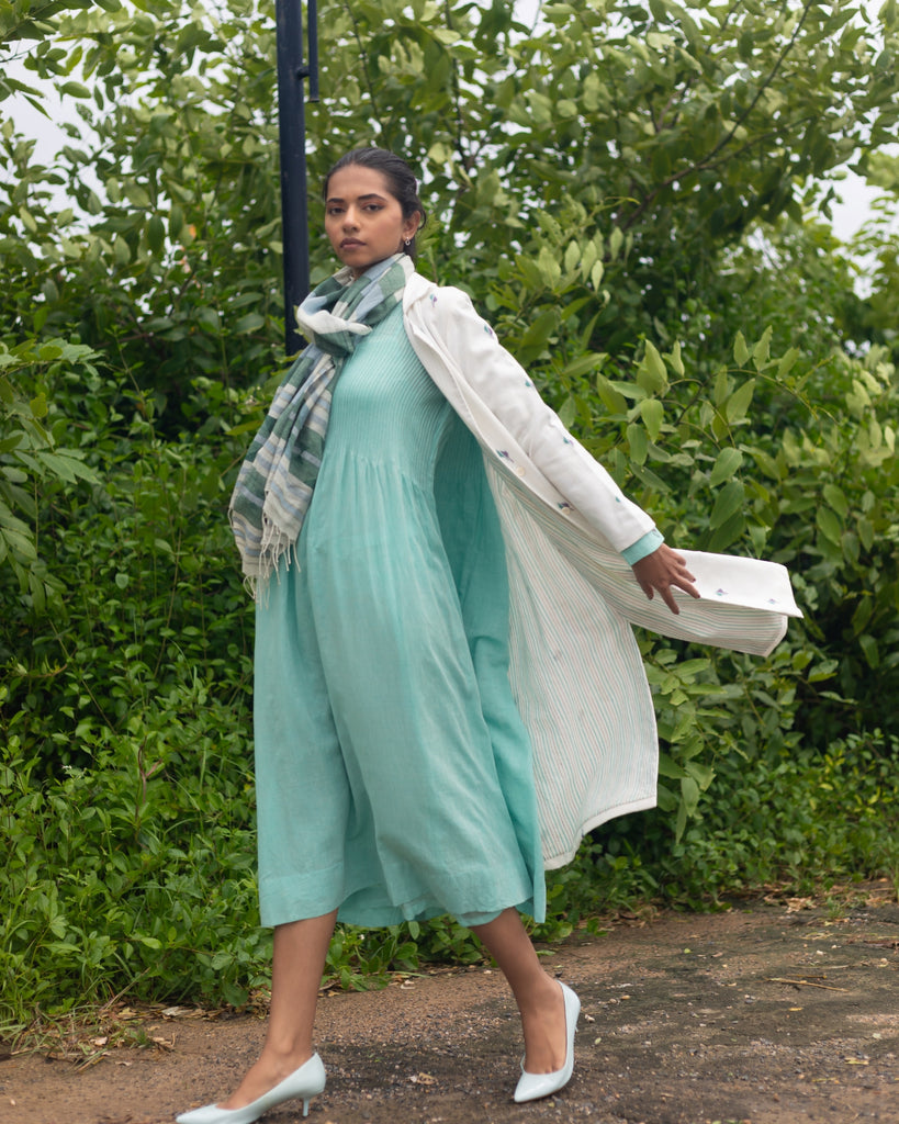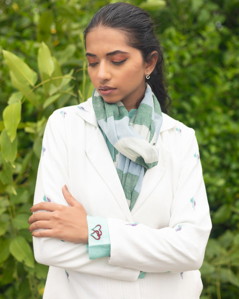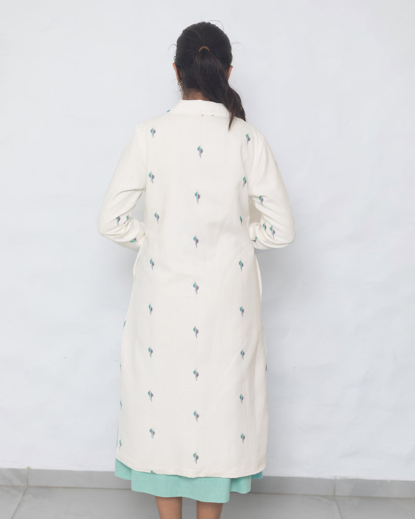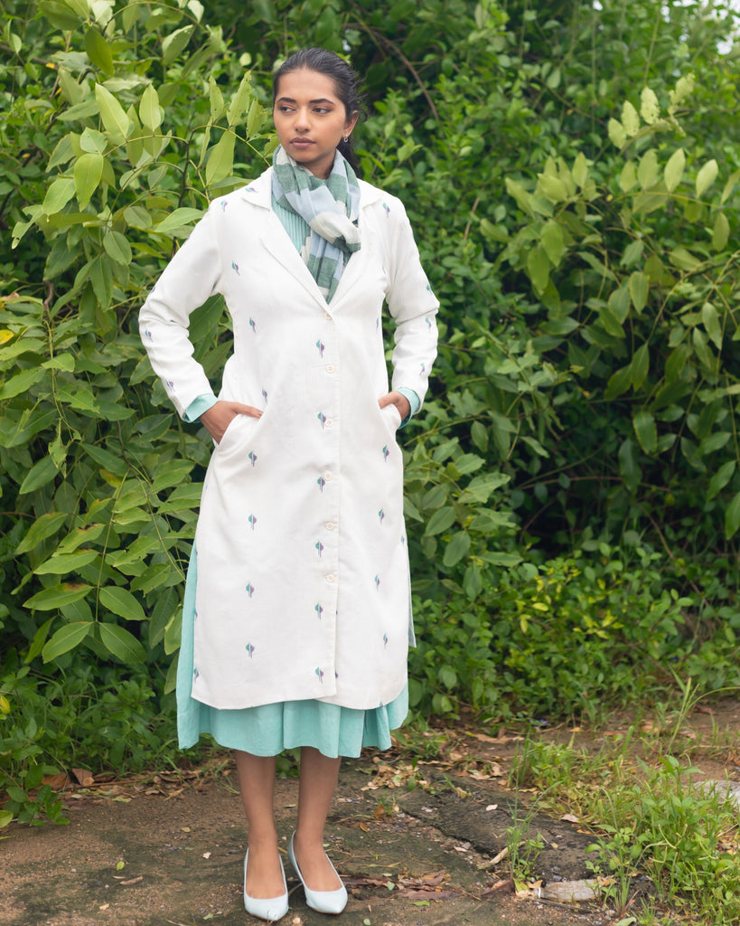 A Symphony of White and Teal: In the harmony of heritage and contemporary style, this jacket sings. The rich white fabric, woven by hand, is gently kissed by teal blue motifs, creating a piece both striking and serene. A notched collar nods to timeless elegance, while side pockets offer a touch of utility. Layer it with tailored pants for the office, or let it float over a flowy dress as you step into the night.
