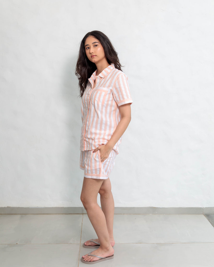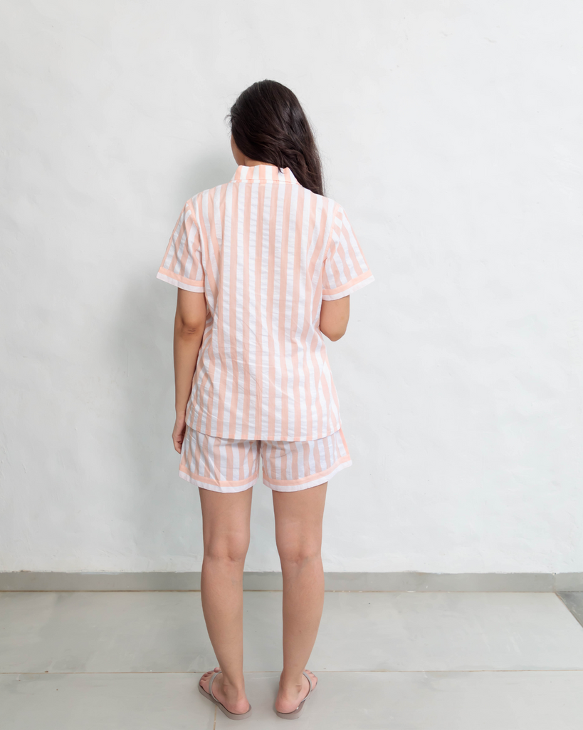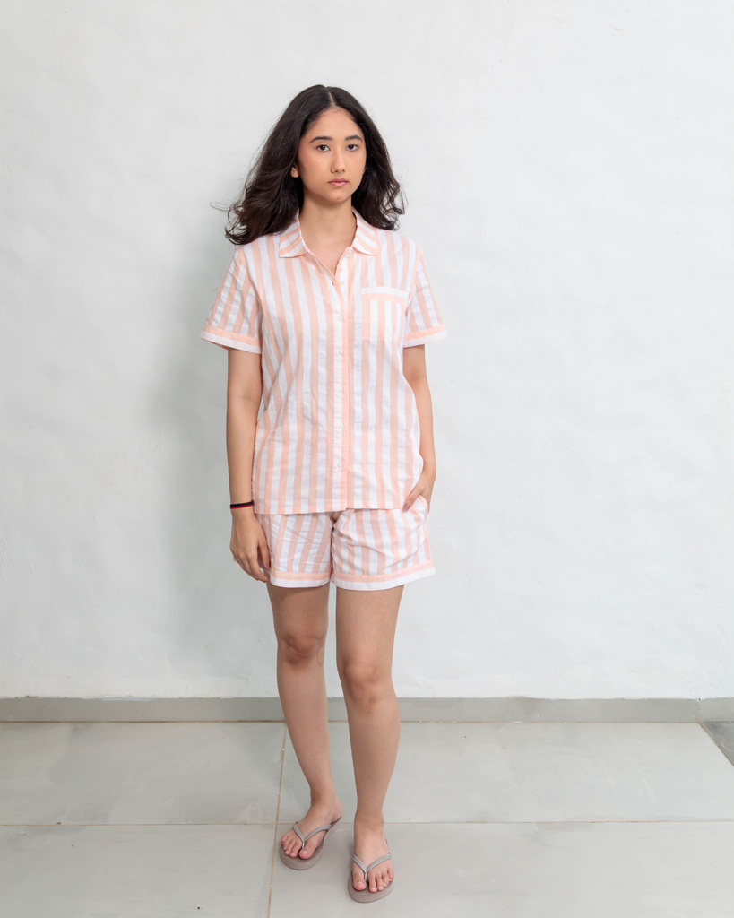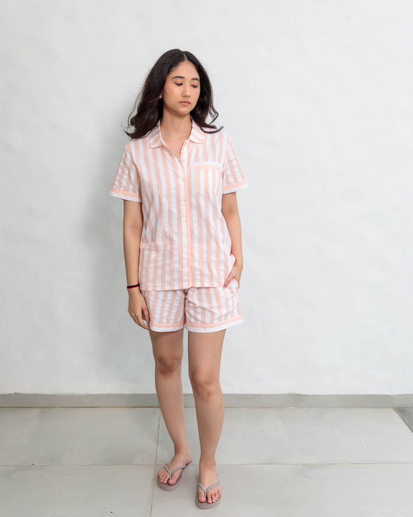 Carrying a fresh essence and simplicity, our 'peach-vanilla swirl' shorts set is definitely a great choice to wear all year long. Shirt collar will give you modern and chic look to dive into a slumber party.